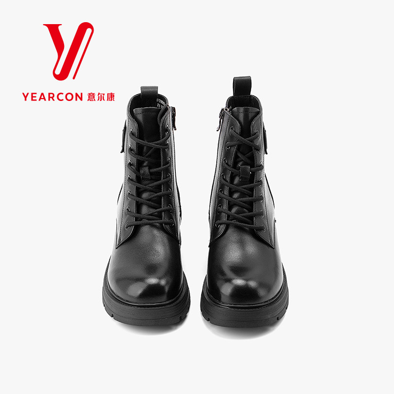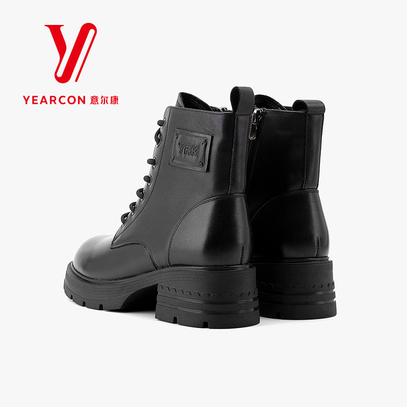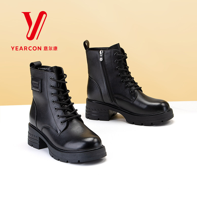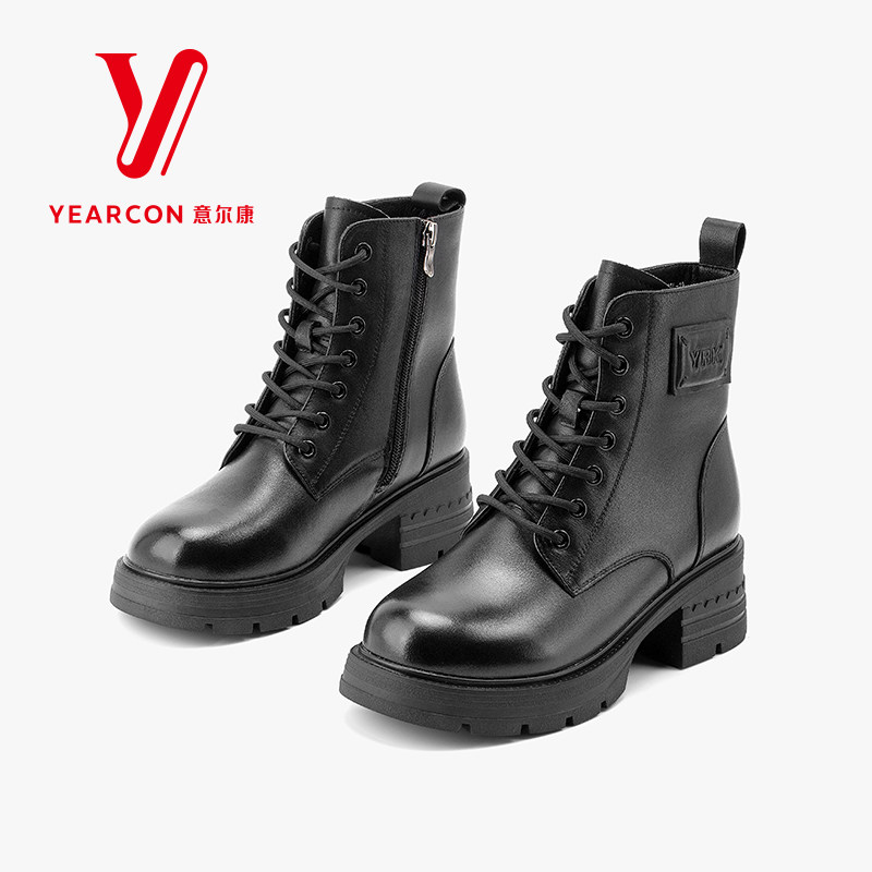 意尔康女靴2025新款冬季真皮马丁靴女粗跟短靴加绒靴子高跟机车靴