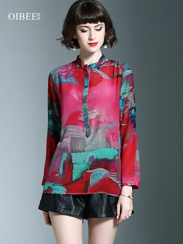 OIBEE桑蚕丝雪纺衫女2025春秋新款长袖衬衫百搭立领印花衬衣上衣
