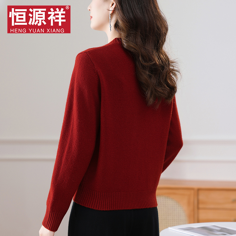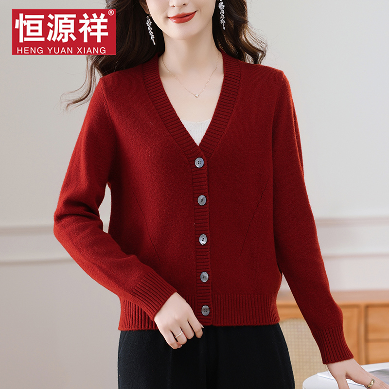 恒源祥红色V领针织开衫厚款上衣春秋2025年新款羊毛衫短款女外套