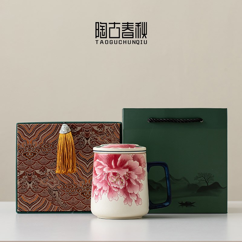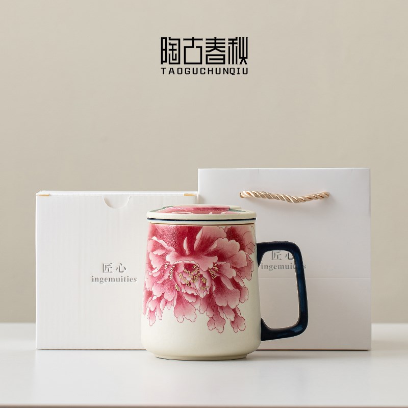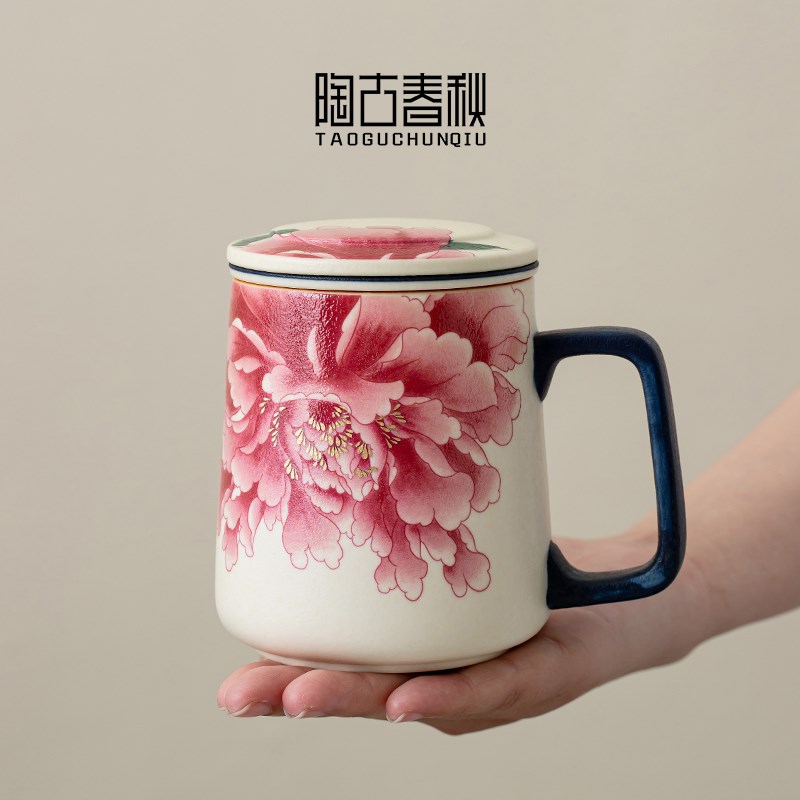 牡丹花青花岩矿白陶瓷泡茶杯茶水分离办公杯带盖过滤水杯个人专用