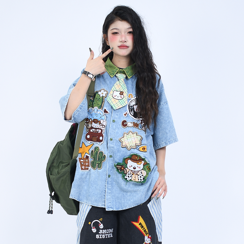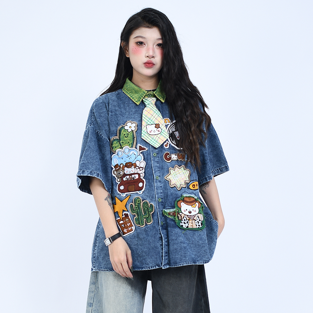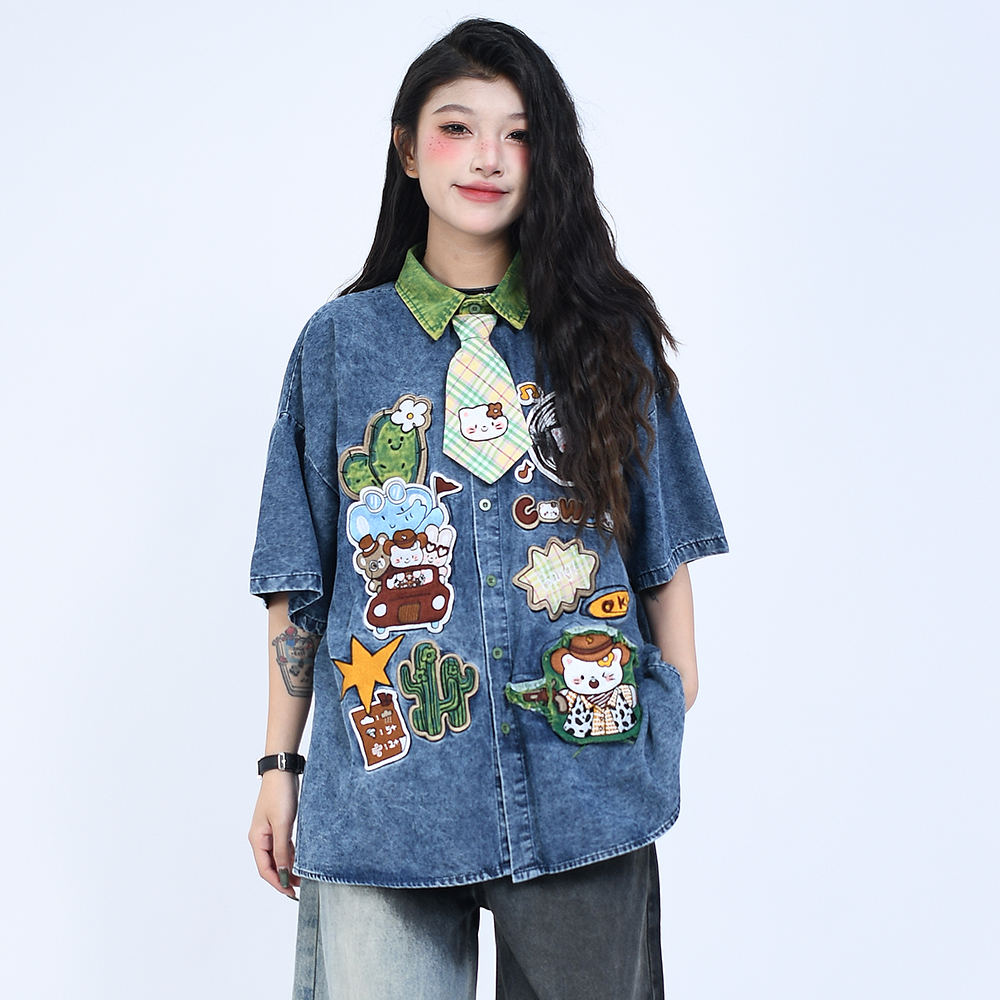 OV原创夏季卡通贴布刺绣做旧水洗牛仔衬衫男女宽松短袖领带衬衣潮