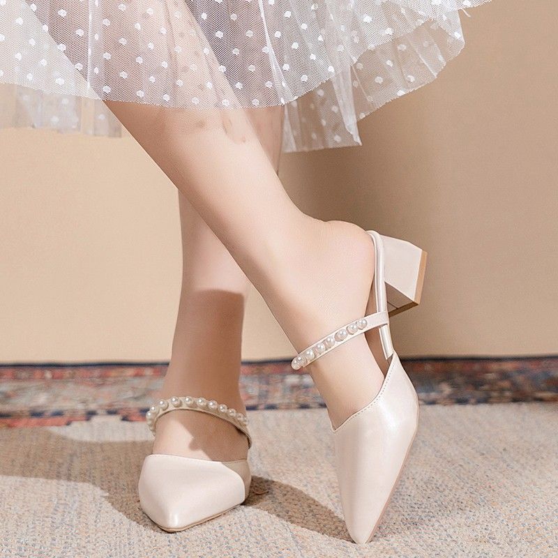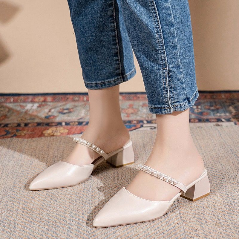 软皮包头中跟半拖鞋女2025新款配裙时尚粗跟方头凉拖鞋外穿女夏季