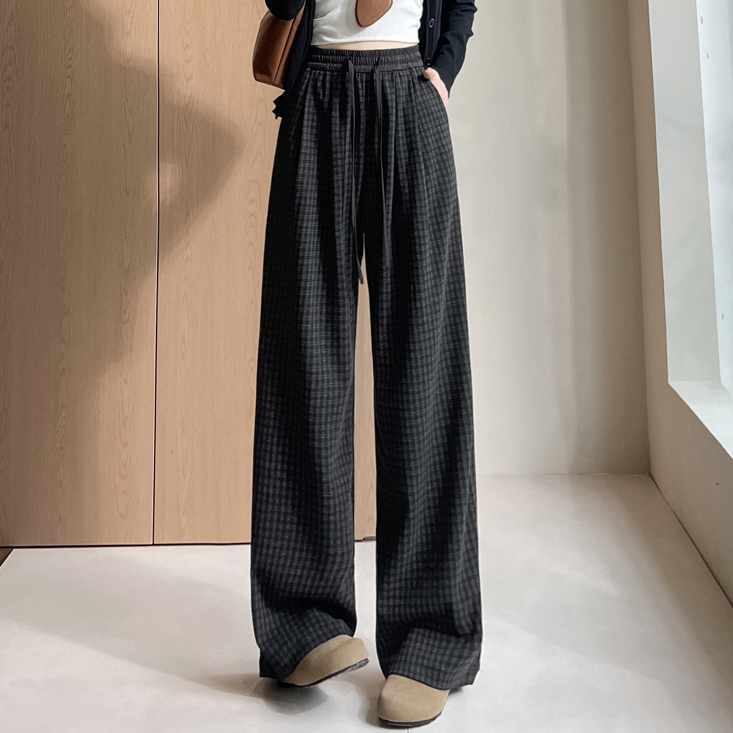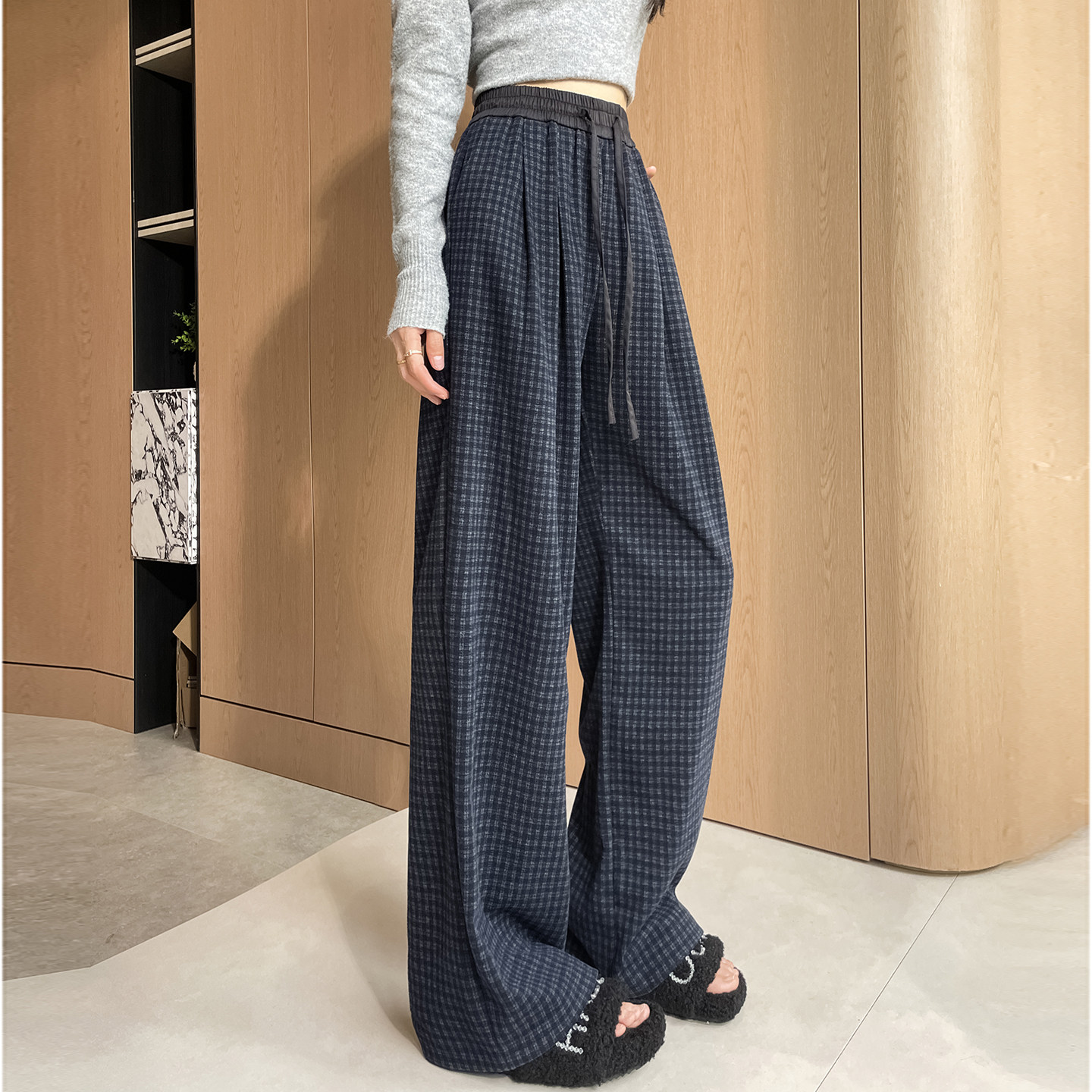 舒适弹力针织格子阔腿裤女小个子新秋款流行直筒宽松加长休闲长裤