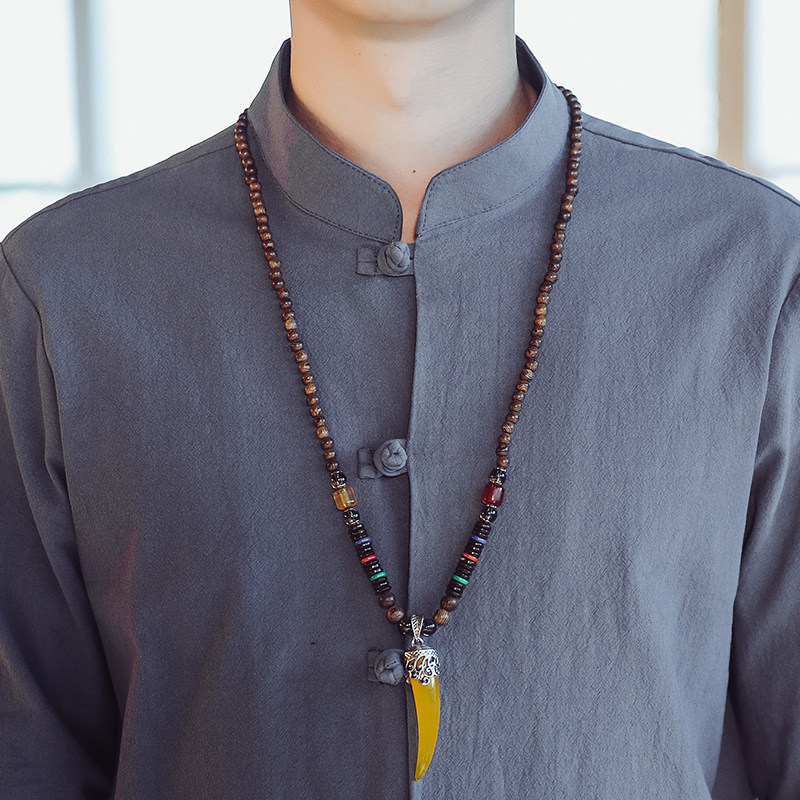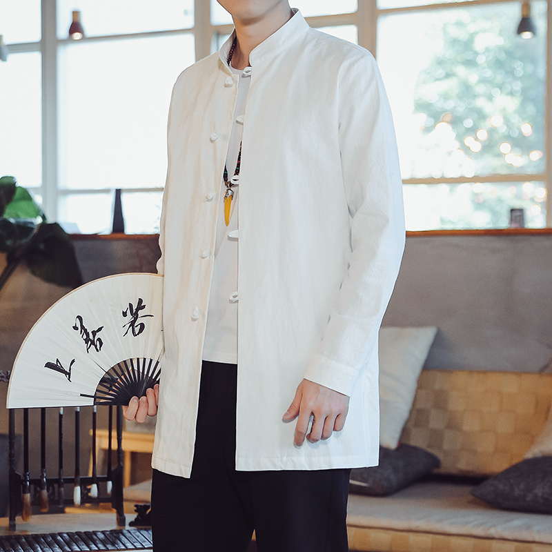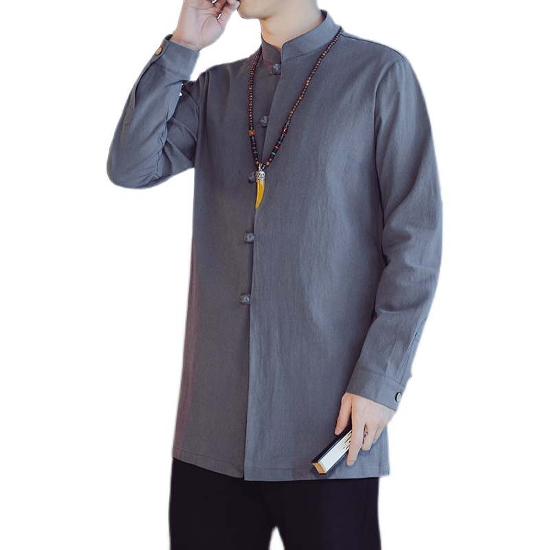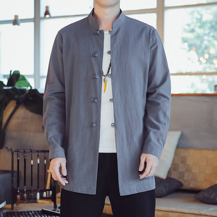 中国风秋季新款棉麻中长款衬衫男复古唐装宽松大码中式开衫风衣男