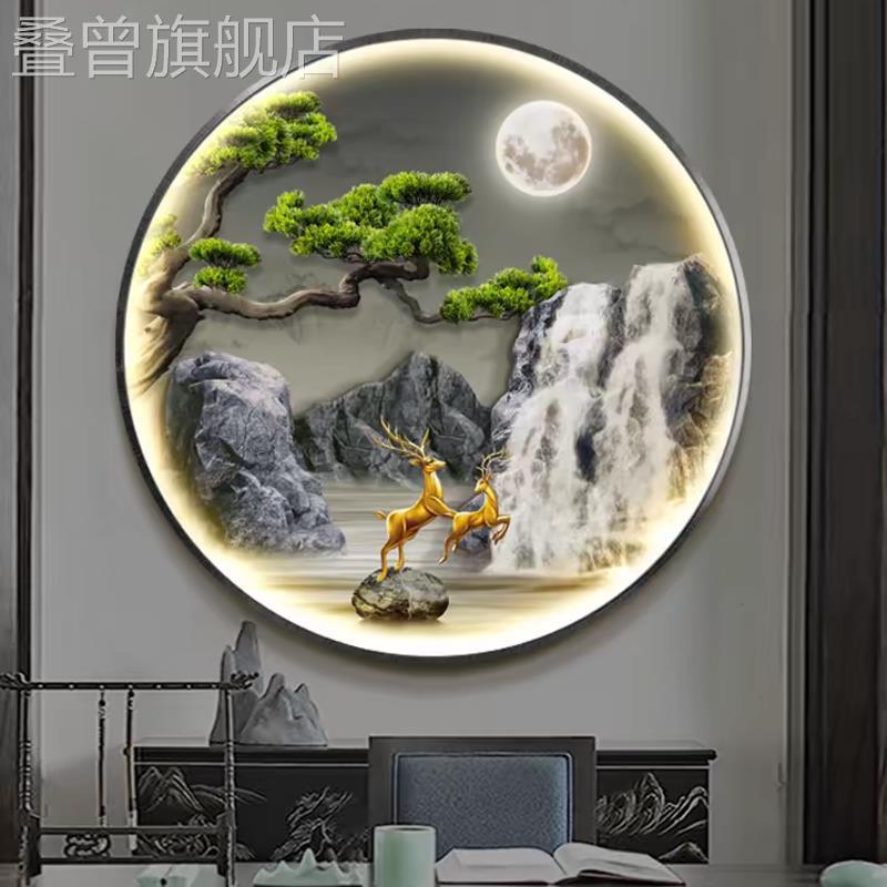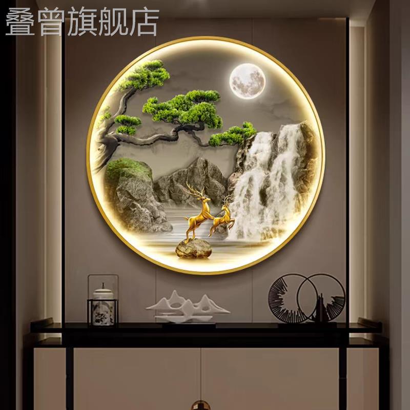 流水生财玄关装饰画大气山水画挂画新中式圆形壁画高级感LED灯画