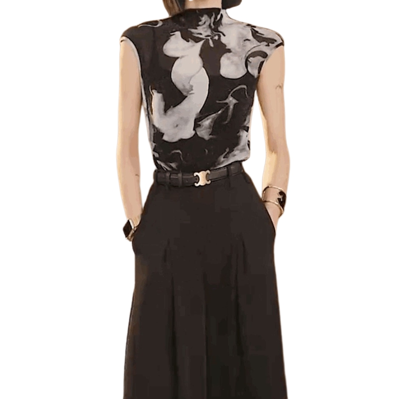 设计感水墨画半高领短袖T恤打底衫女夏时尚修身法式蕾丝网纱上衣