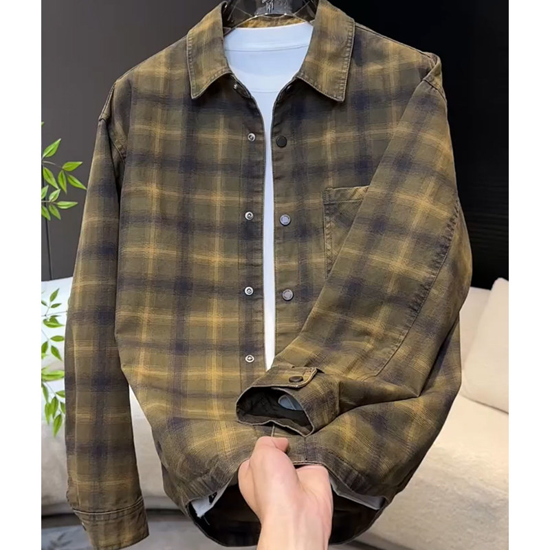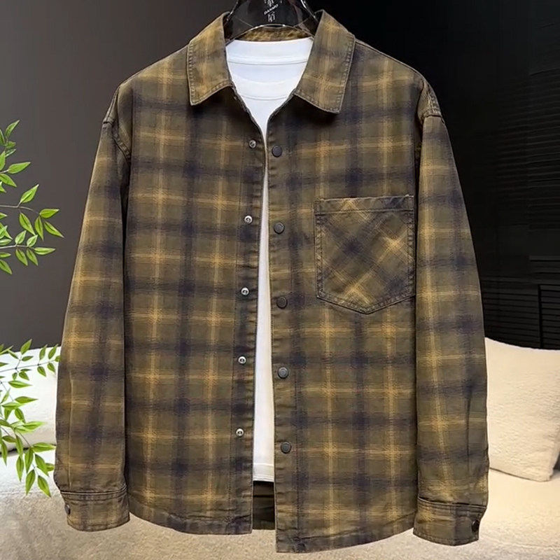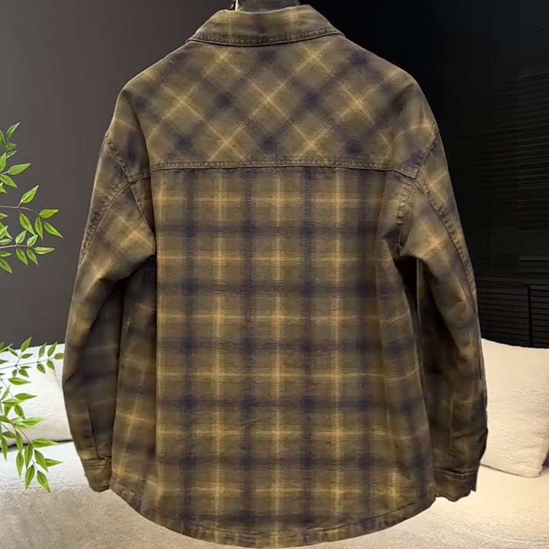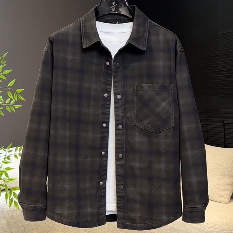 秋冬季美式复古牛仔外套男款休闲衬衫宽松帅气格子男夹克痞帅潮牌