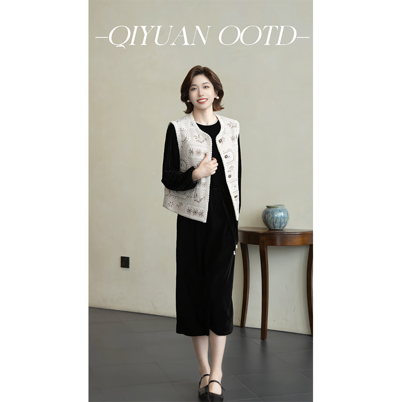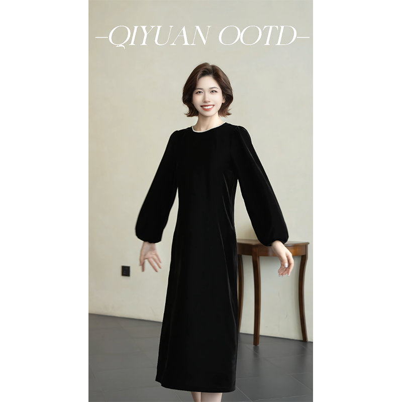 柒院家大码女装设计感烫钻圆领丝绒连衣裙2025秋款宽松遮肉中长裙