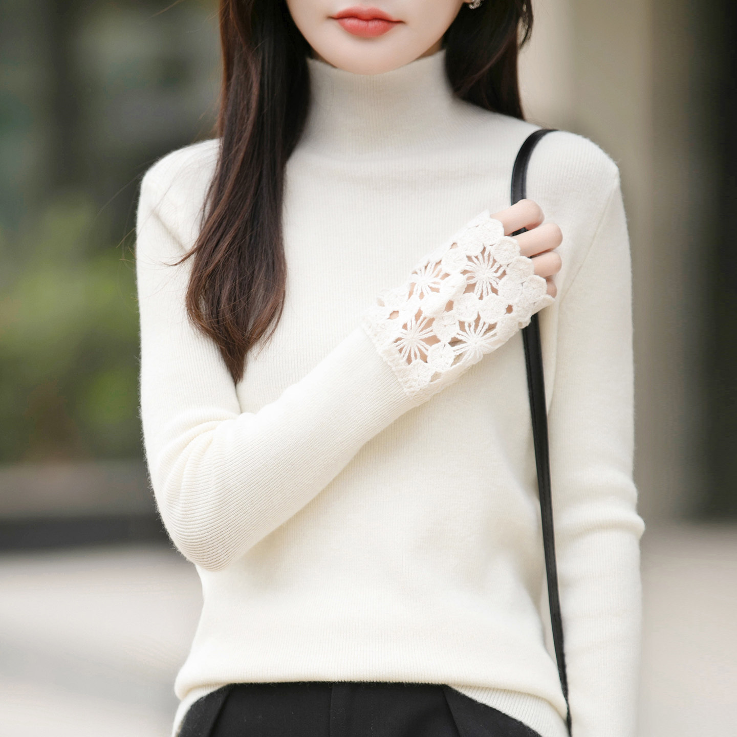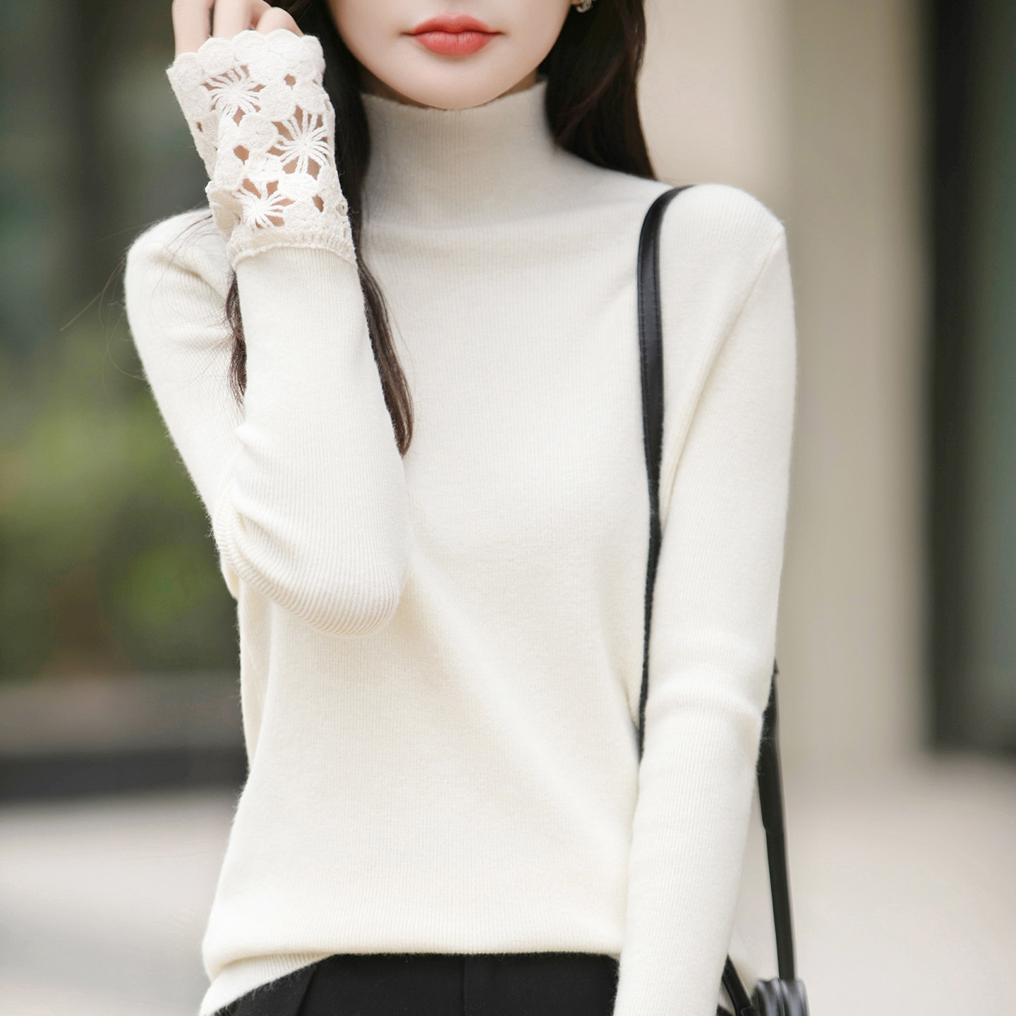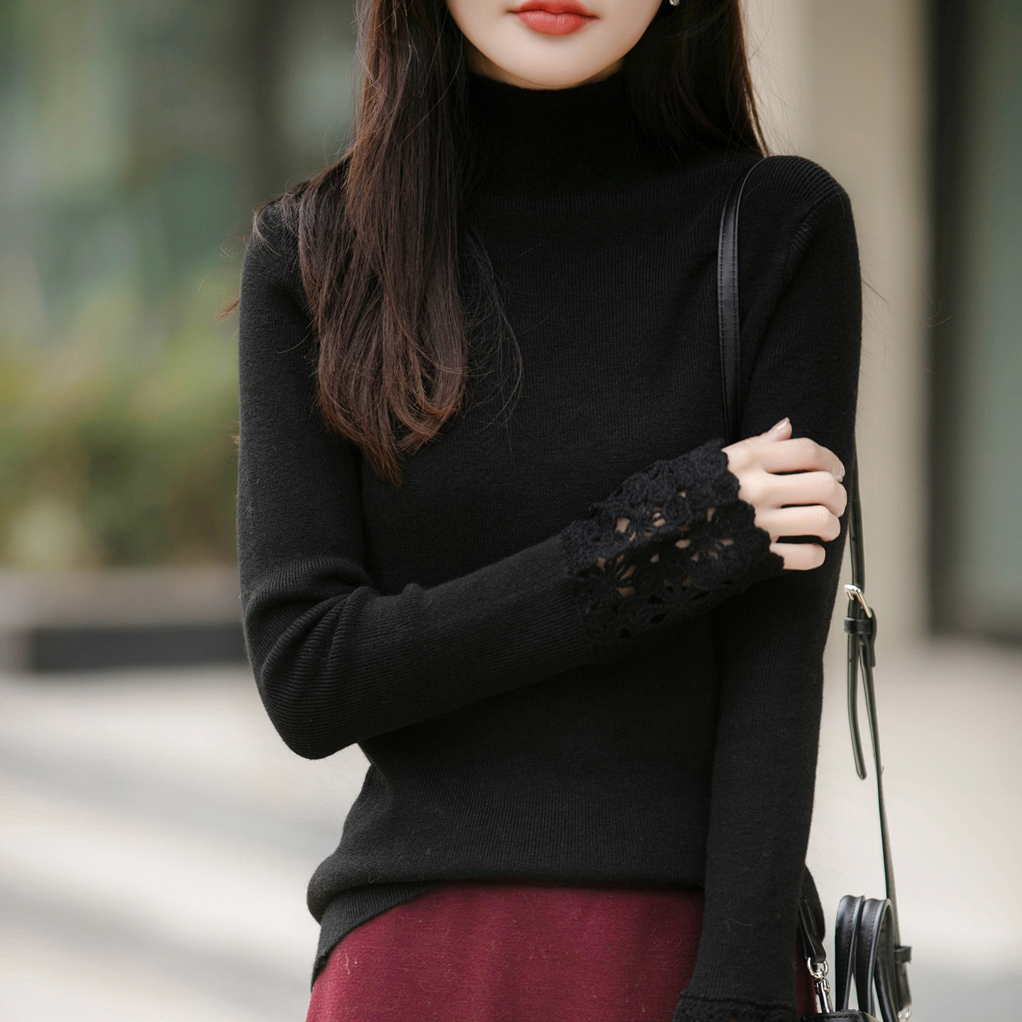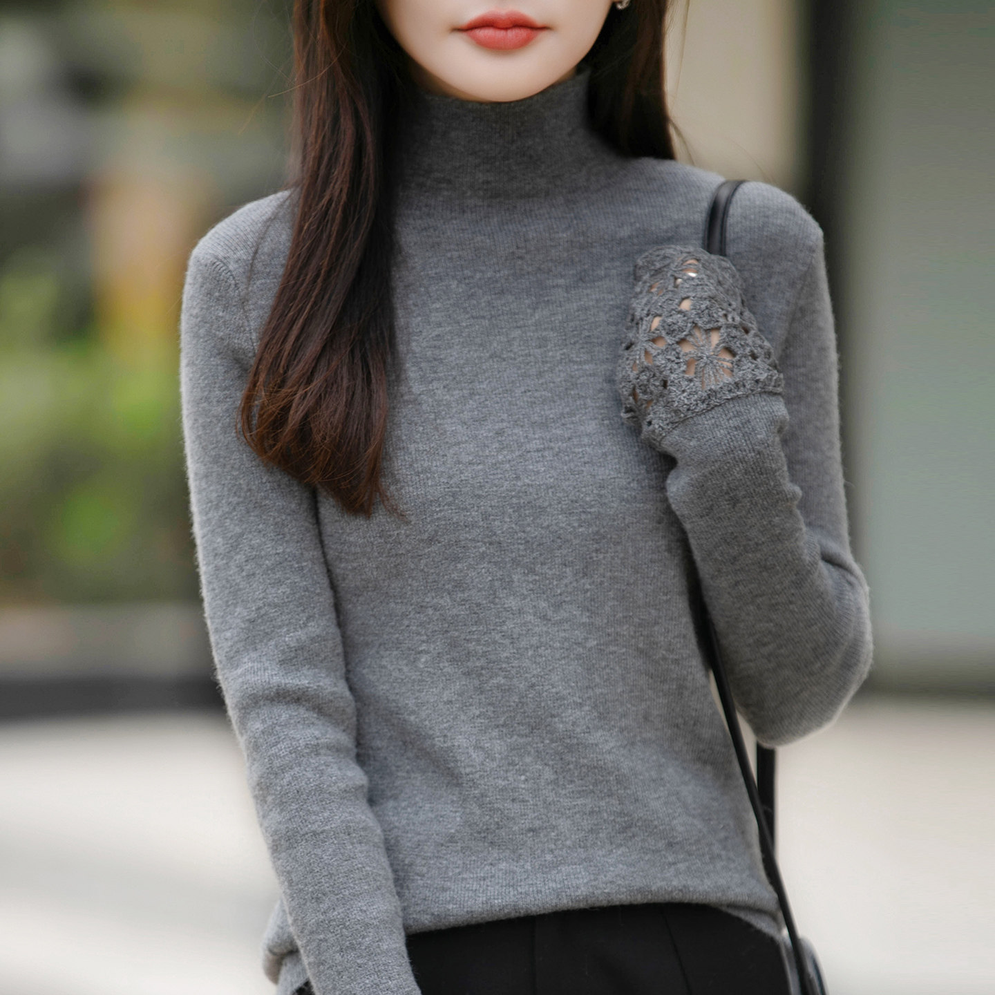 花边袖半高领纯色女修身显瘦毛衣长袖打底毛衣灰色内搭针织衫上衣