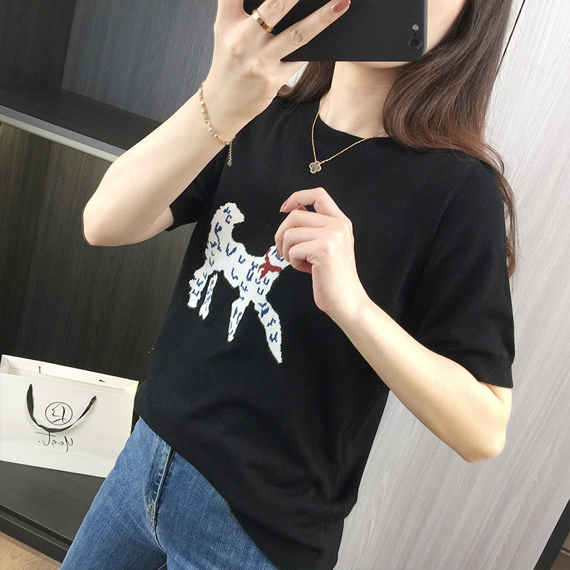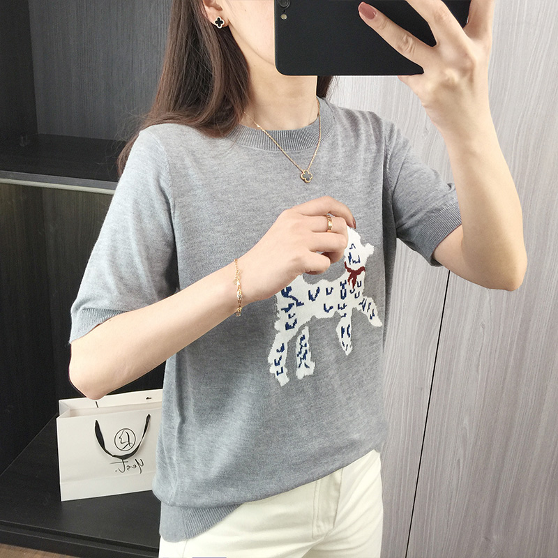 洋气减龄卡通图案针织衫女夏季宽松显瘦上衣圆领套头正肩短袖T恤
