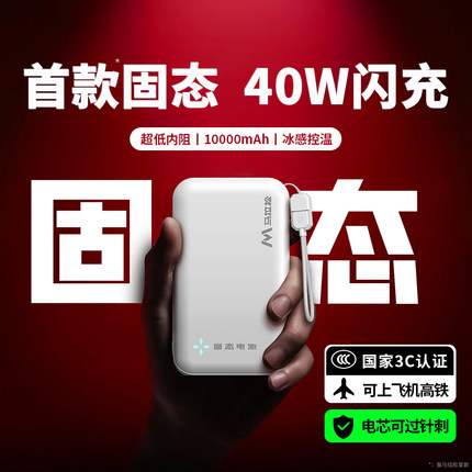 充电宝3C认证可上飞机【固态电池】马拉松固态充电宝自带线10000毫安超大容量40W快充超薄小巧便携适用苹果