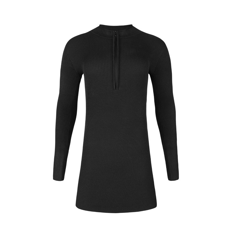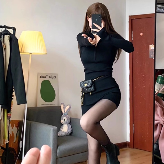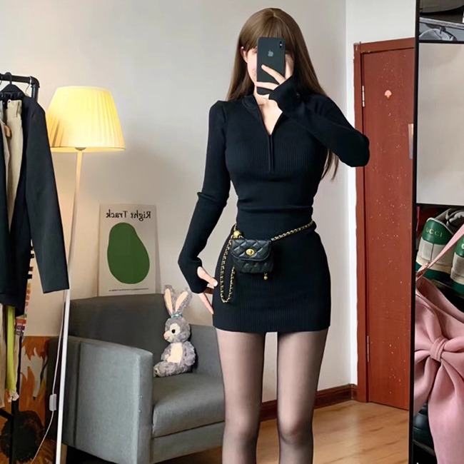 加绒辣妹性感拉链打底针织连衣裙女秋冬新款修身紧身包臀毛衣短裙