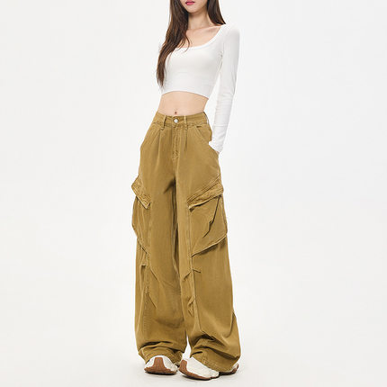 美式复古宽松拖地工装牛仔裤女春秋大口袋褶皱设计