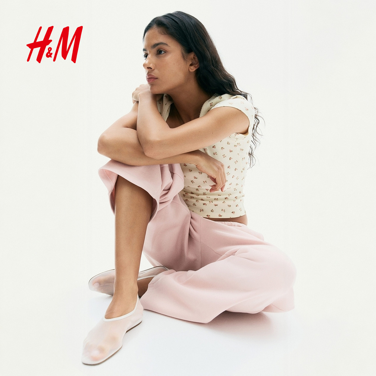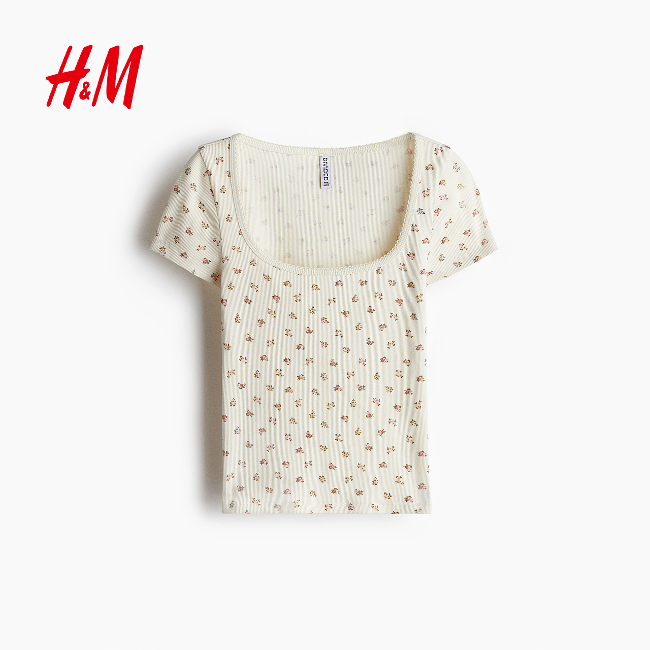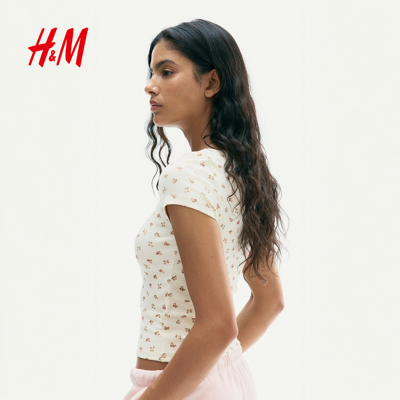 HM女装T恤2025年秋季新款小环饰边低方领罗纹修身短袖上衣1292589
