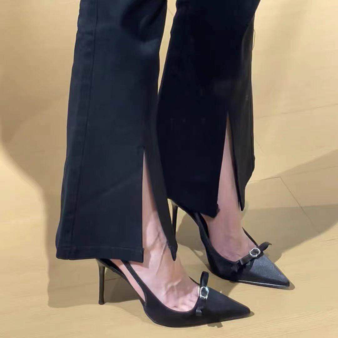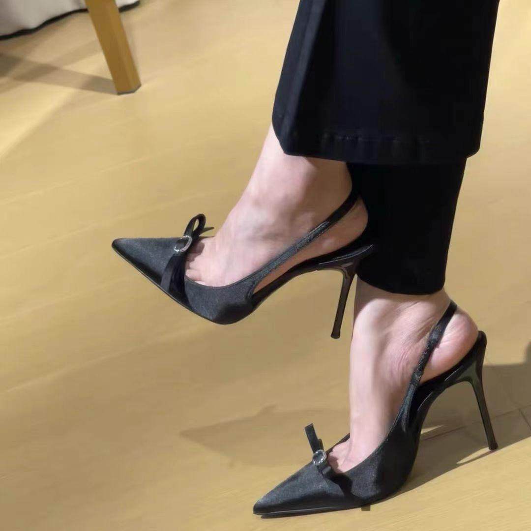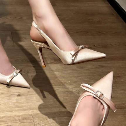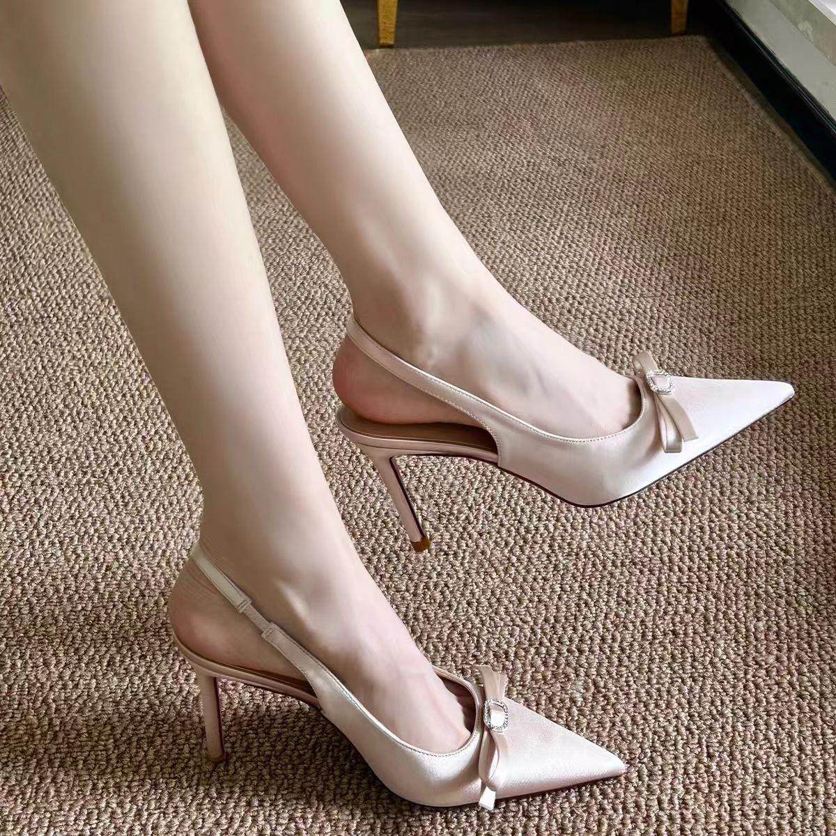 高跟鞋女2025新款春夏季细跟性感蝴蝶结尖头浅口单鞋百搭后空凉鞋
