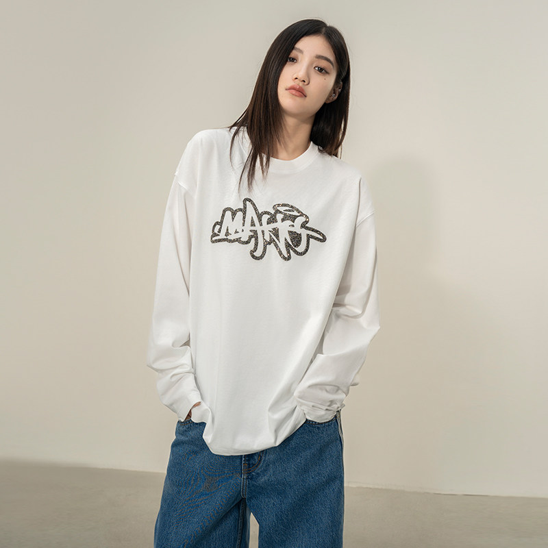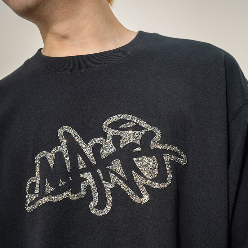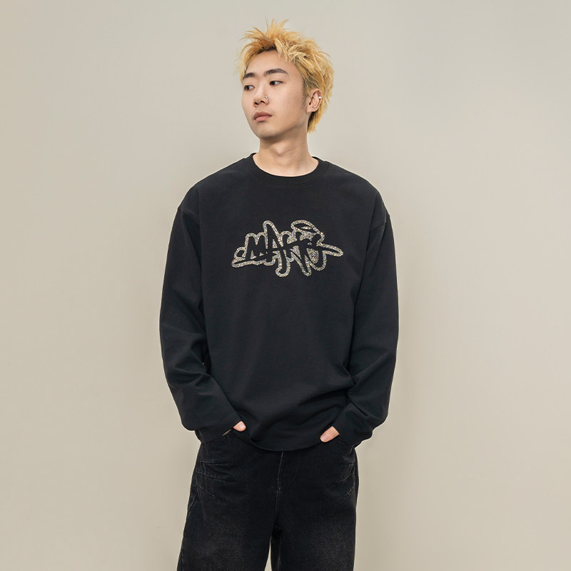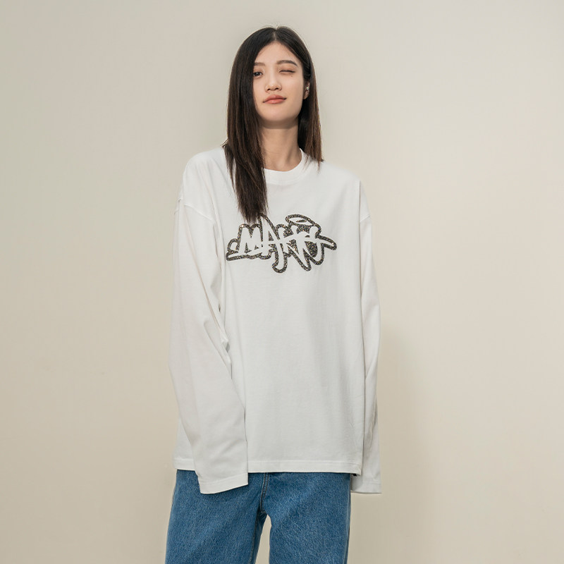 Makemore长袖T恤男*碎钻时间宽松美式纯棉重磅复古情侣装质感上衣