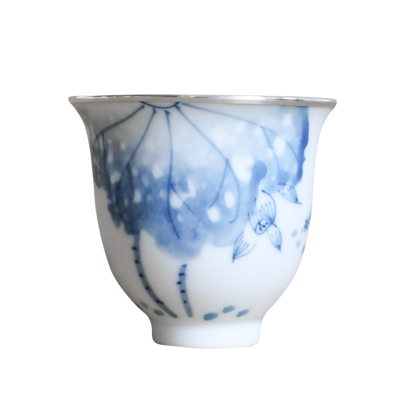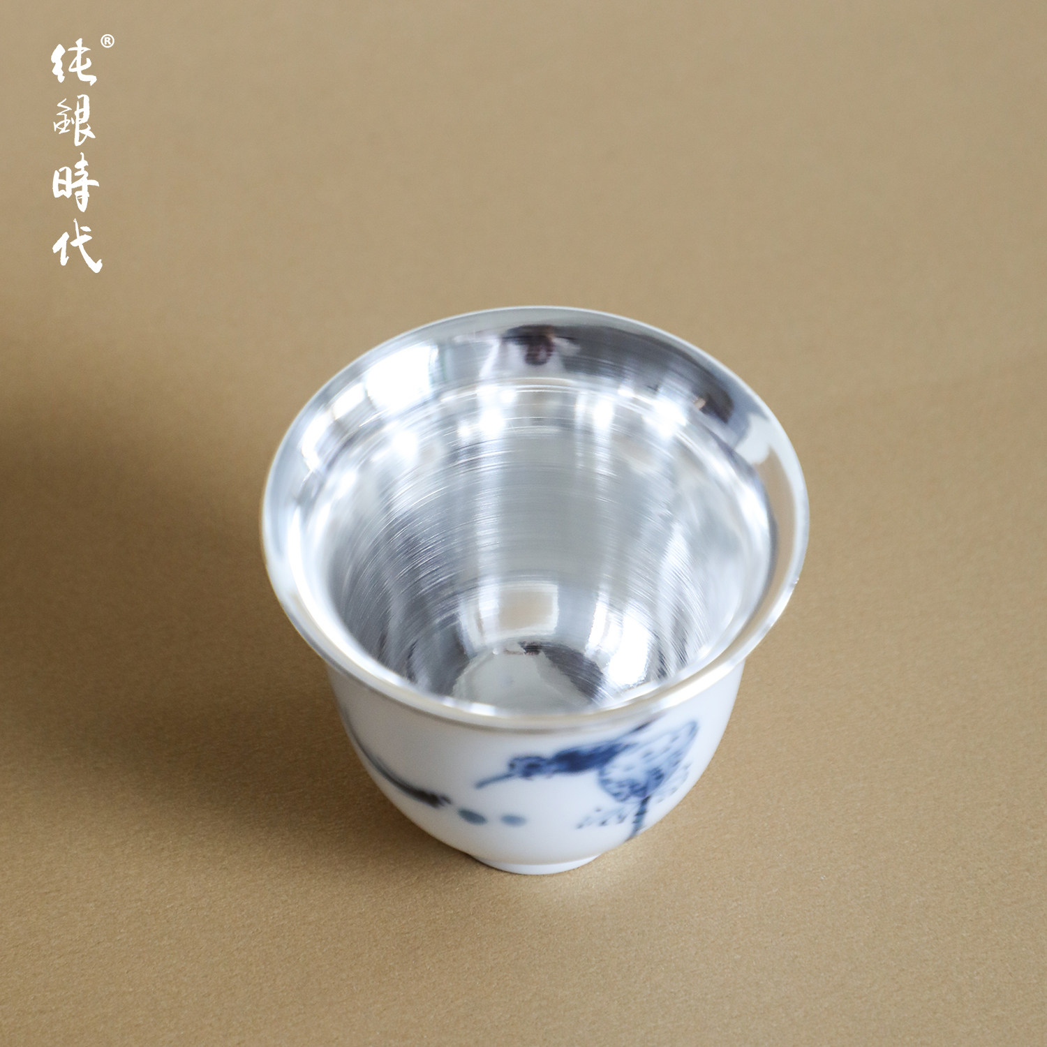 纯银时代 十里荷花瓷包银杯礼盒手绘品茗杯999足银主人杯送礼60ml