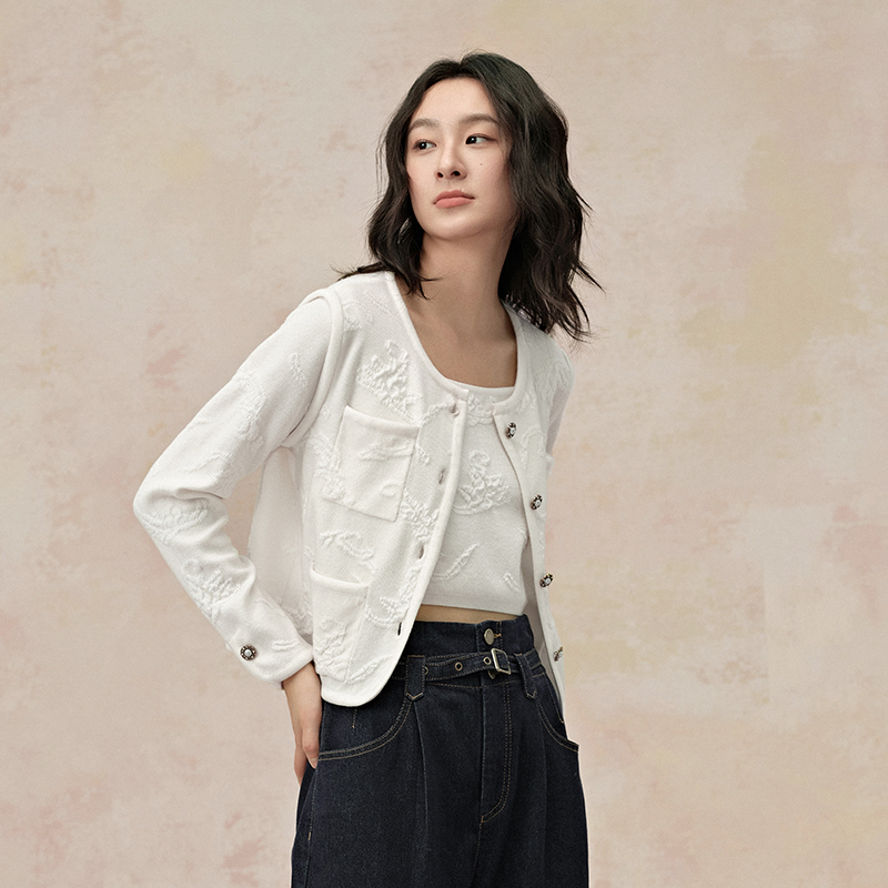 PIT白色复古针织衫百搭2025新款暗纹刺绣开衫上衣设计高级感