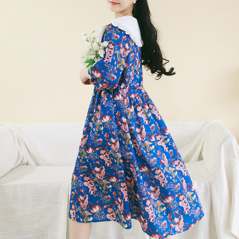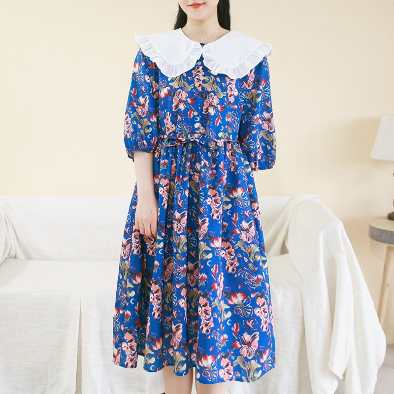 胖妹妹雪纺印花娃娃领减龄连衣裙大码五分袖长裙