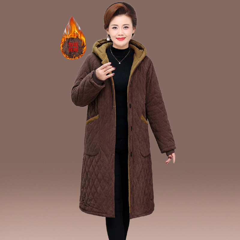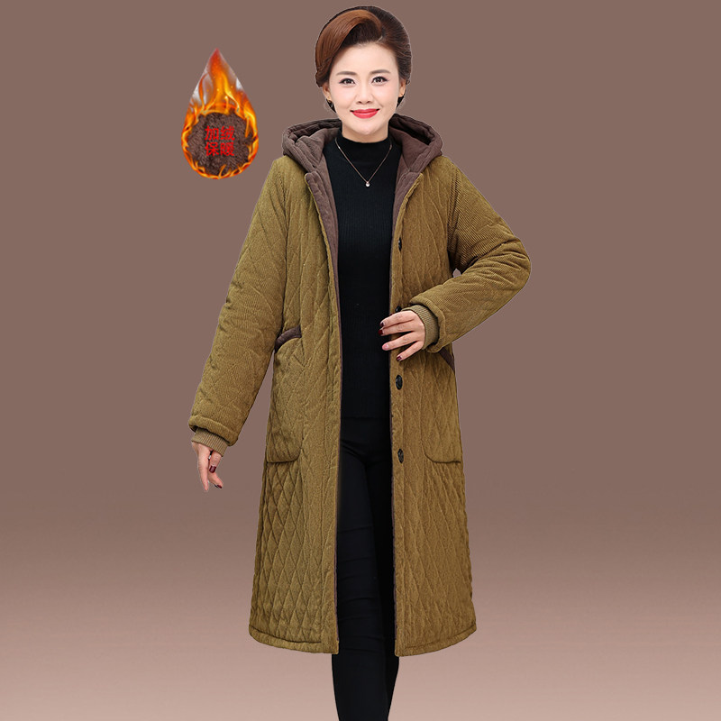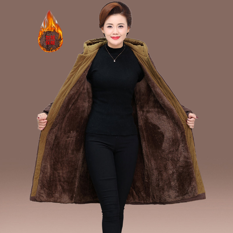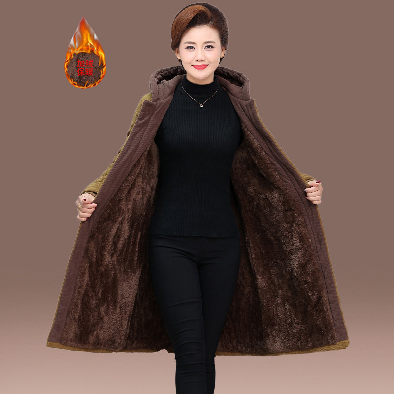 妈妈冬装新款加绒加厚大码外套棉袄中老年女中长款灯芯绒棉衣棉服