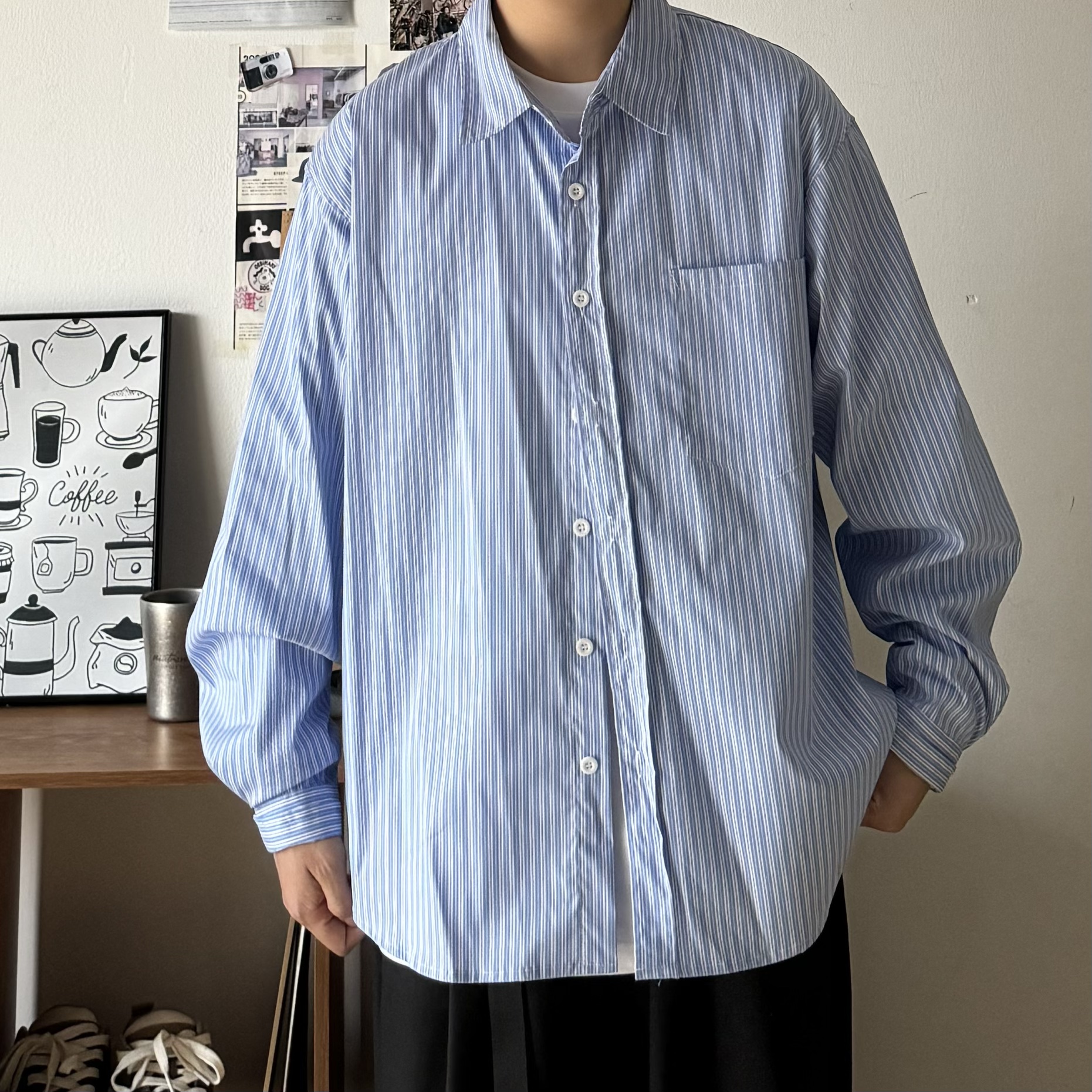 B东日系男装秋日潮复古街头基础蓝色条纹少年感衬衫中性长袖衬衣