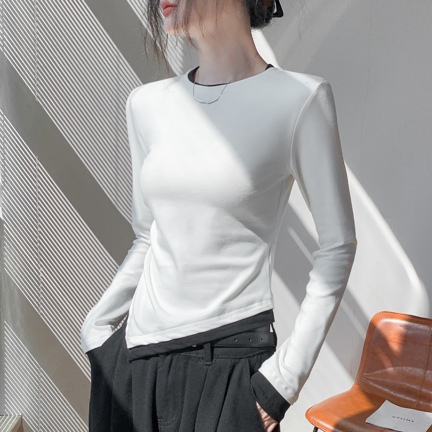 修身圆领斜下摆假两件长袖T恤女