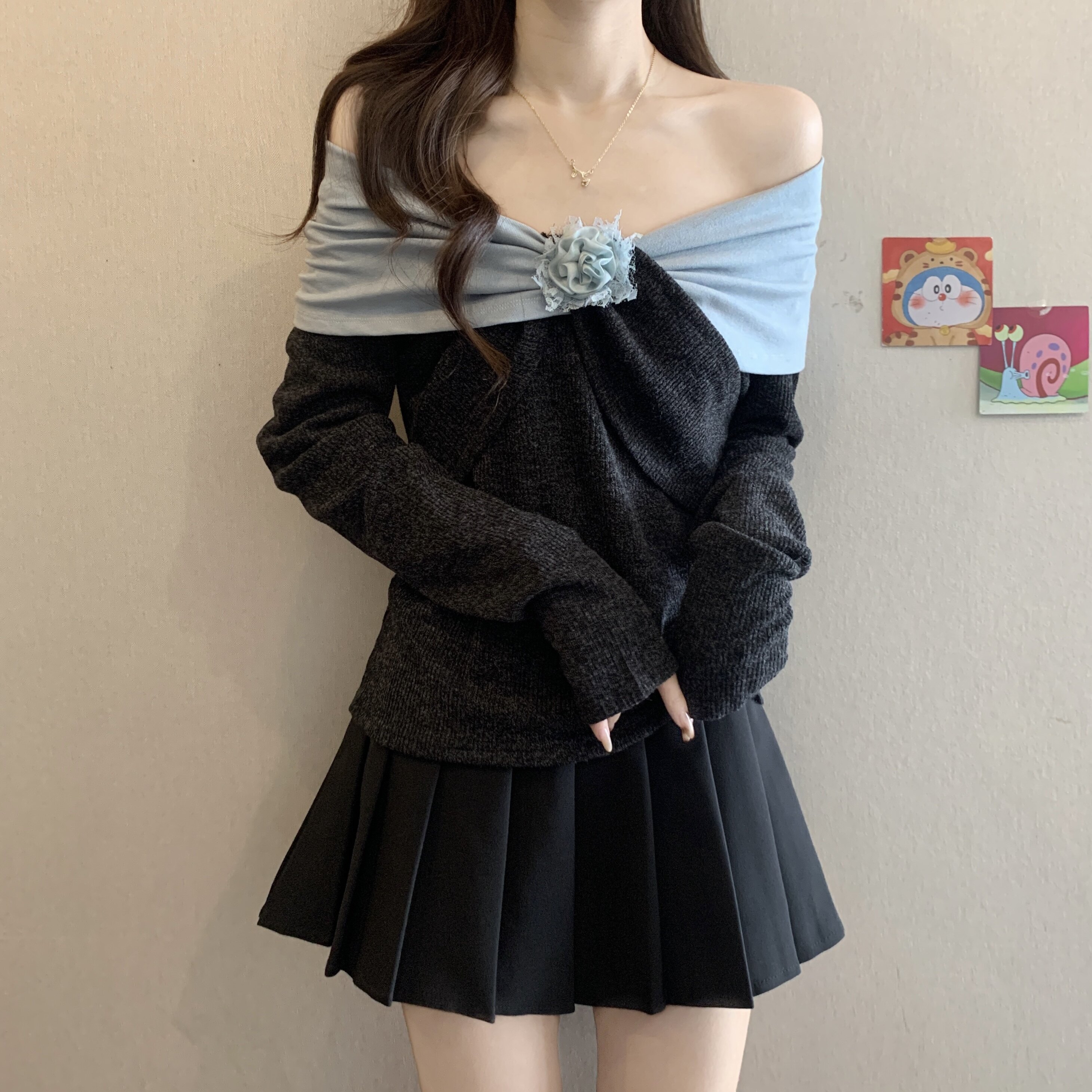 设计撞色衬衣拼接扭结手工花朵
