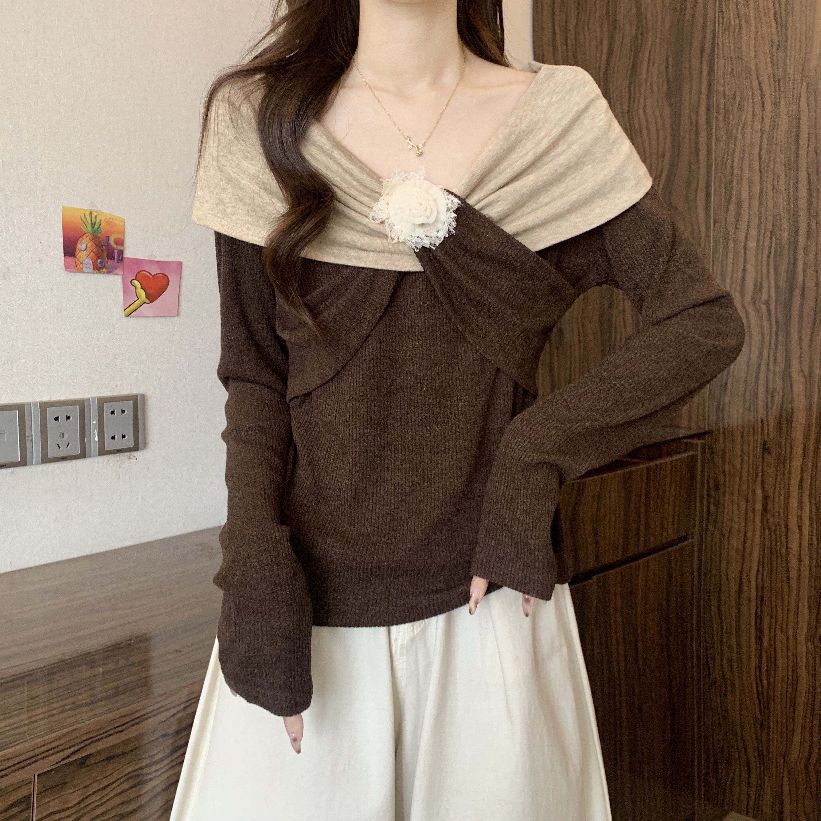 胖MM2026秋季新款设计撞色衬衣拼接扭结手工花朵上衣收腰显瘦小衫