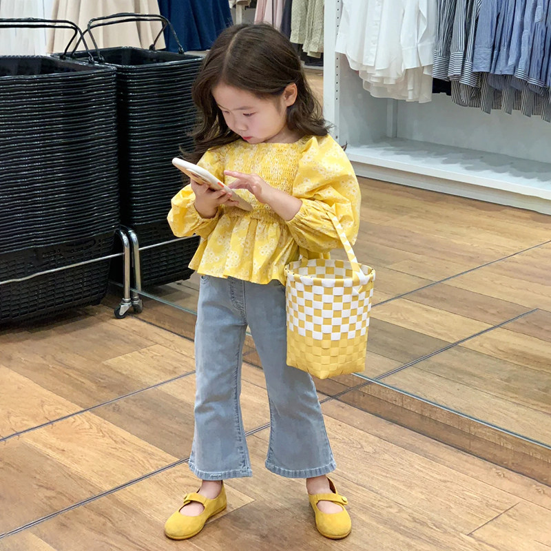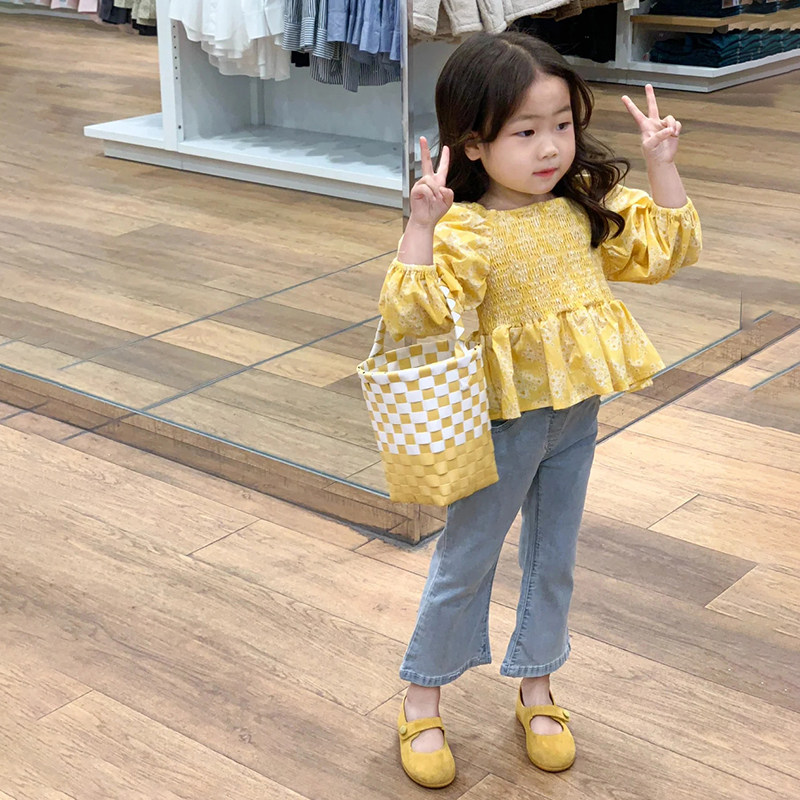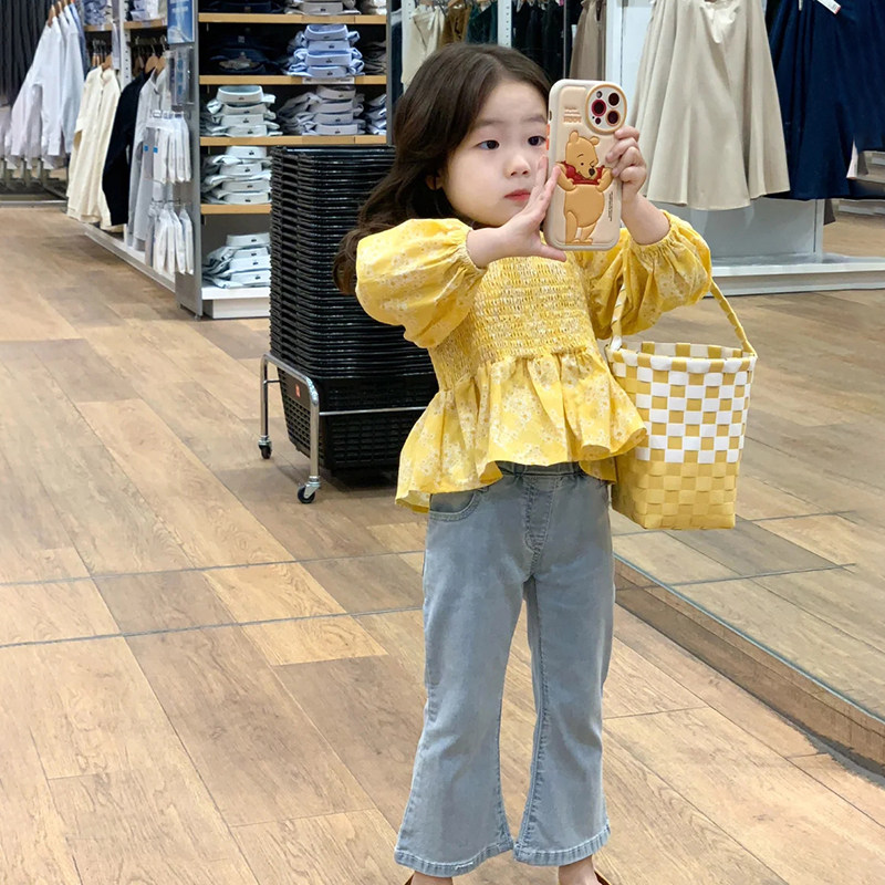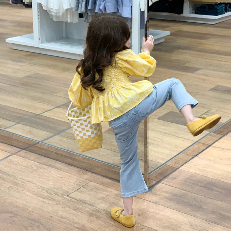 秋季新款韩版女童时髦洋气套装儿童泡泡袖碎花衬衫牛仔喇叭裤子