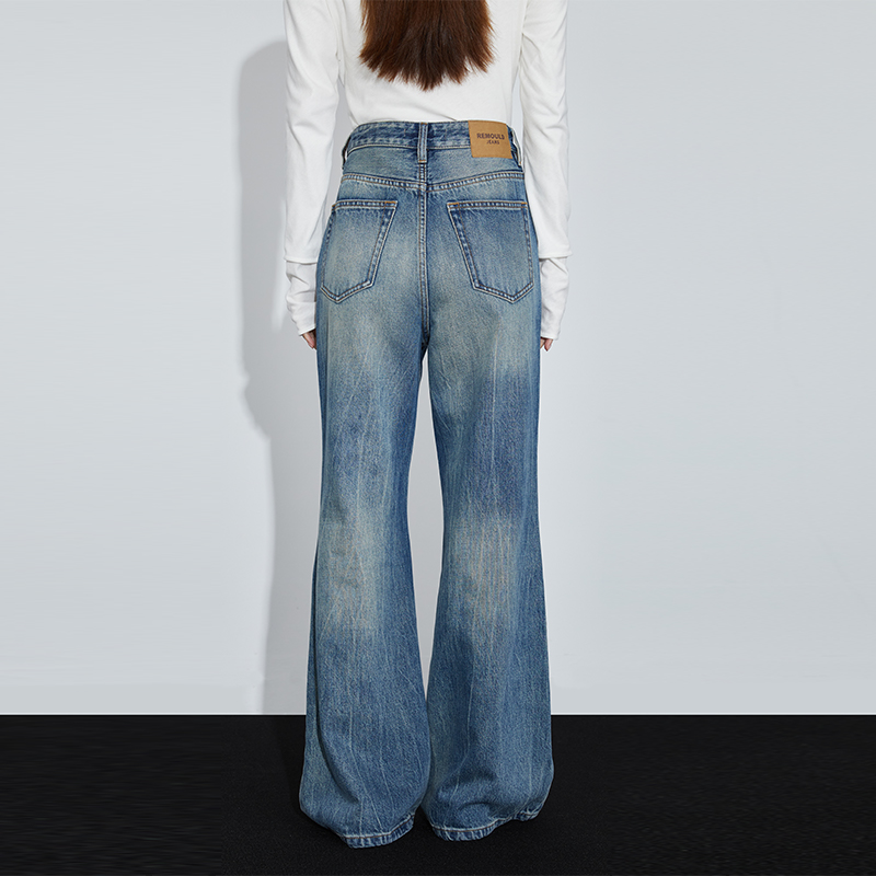 REMOULD 美式复古做旧蓝色微喇显瘦高腰宽松直筒拖地喇叭牛仔裤女