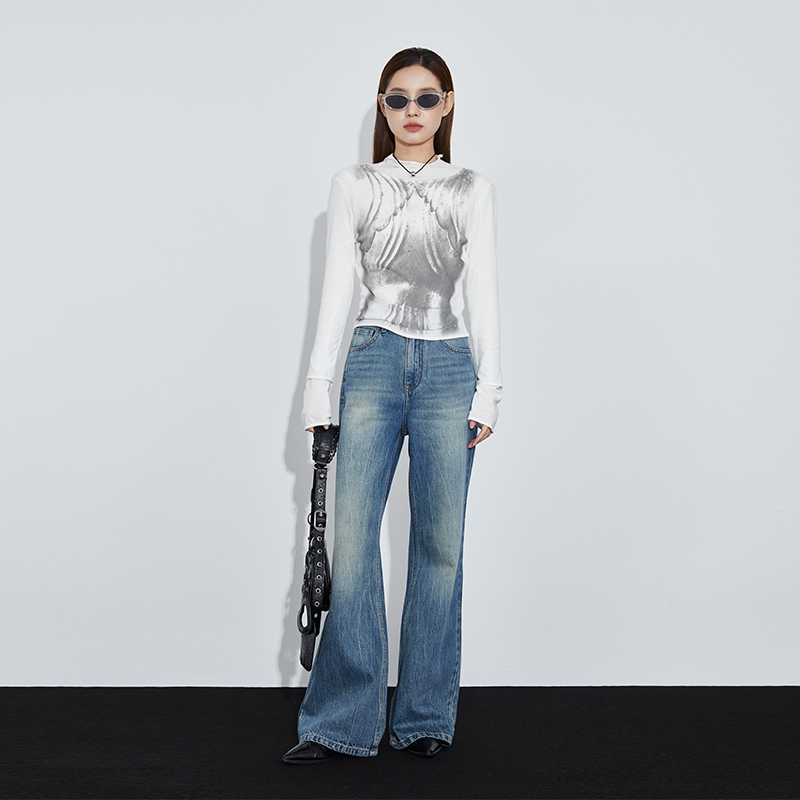 美式复古做旧蓝色微喇显瘦牛仔裤