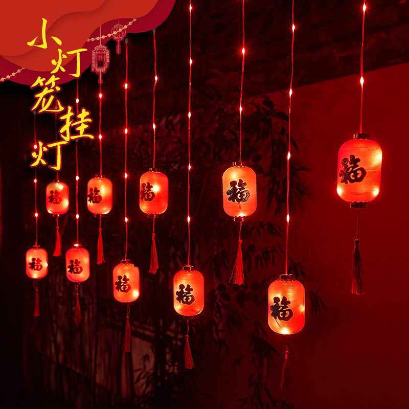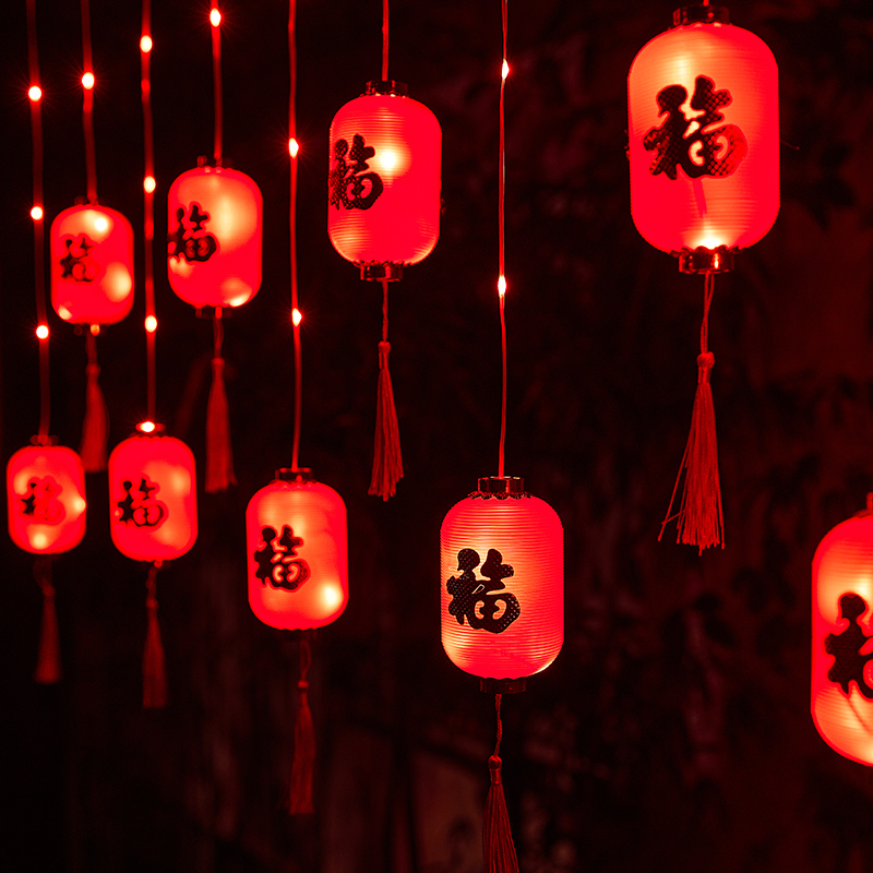 新年福字小红灯笼led彩灯闪灯串灯满天星户外窗帘灯过年装饰挂件