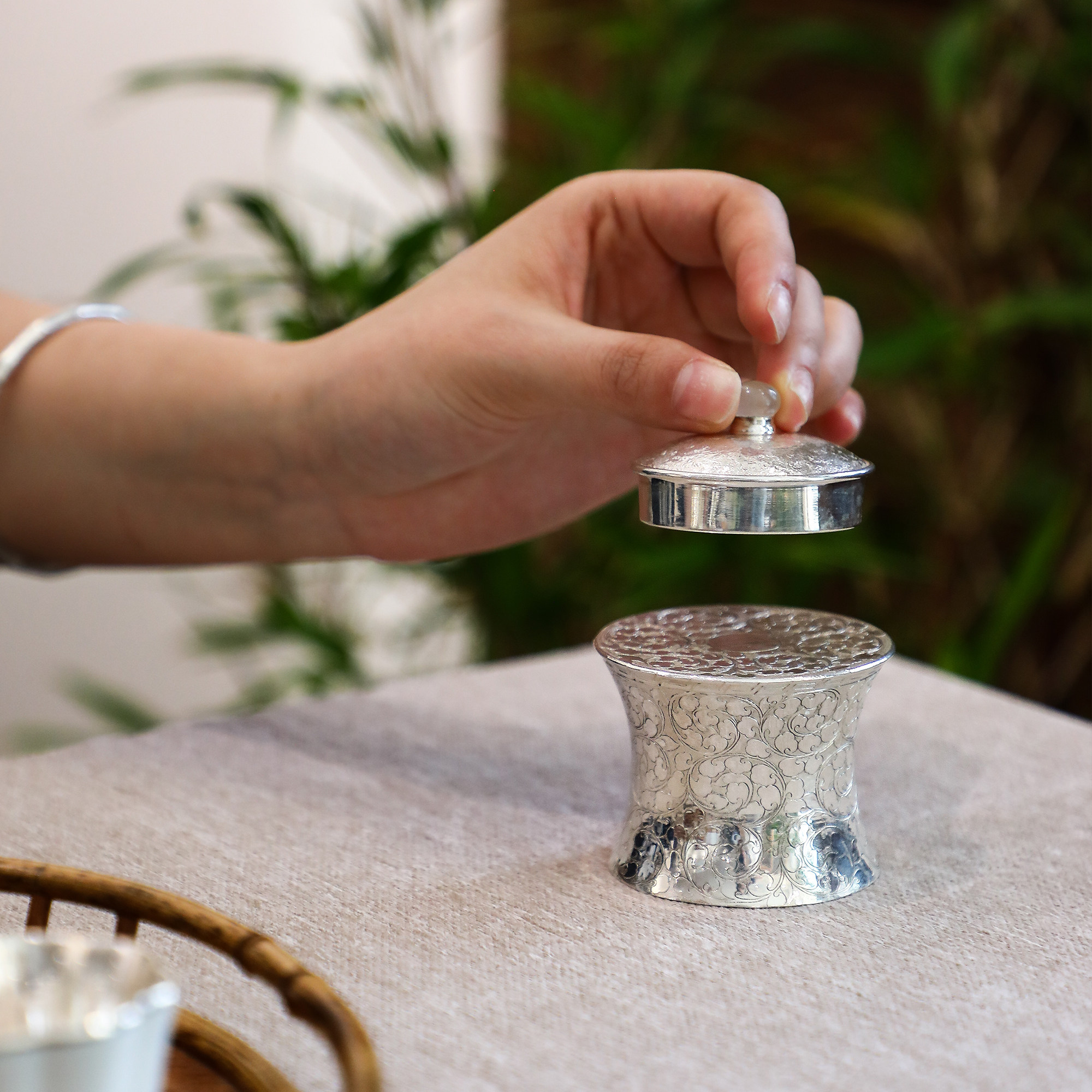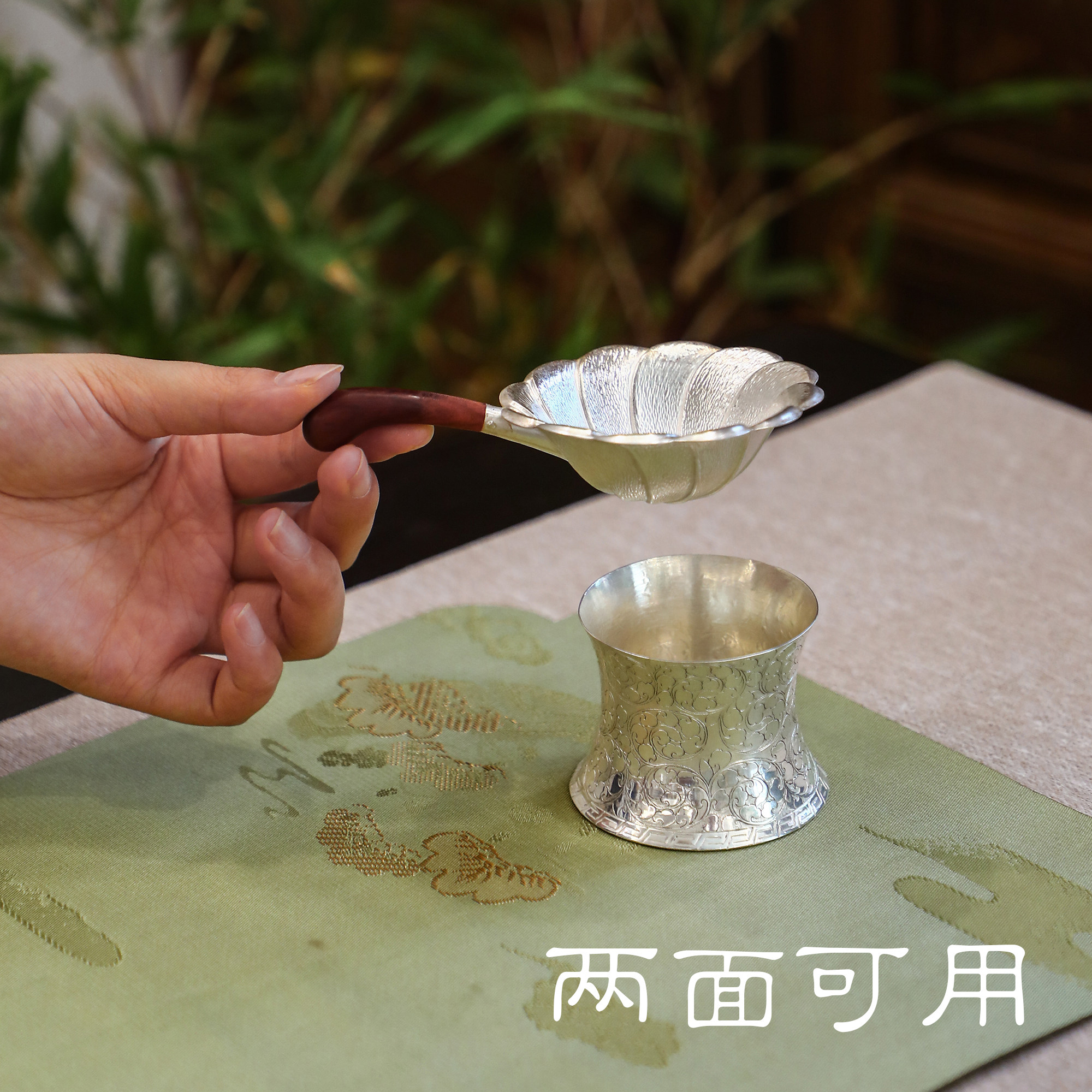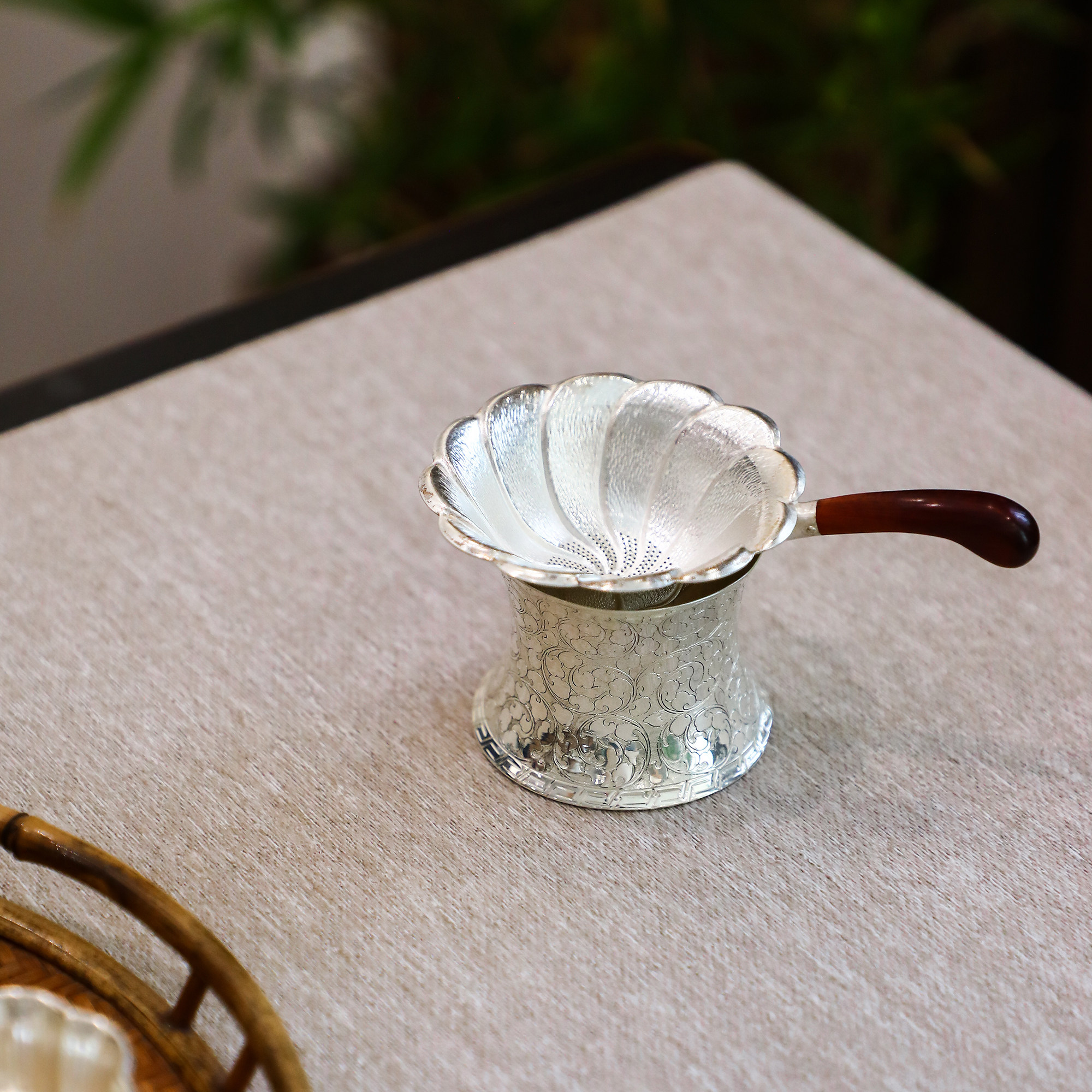 纯银时代 锤纹缠枝盖置茶滤架托足银999手工茶具家用茶漏托底座