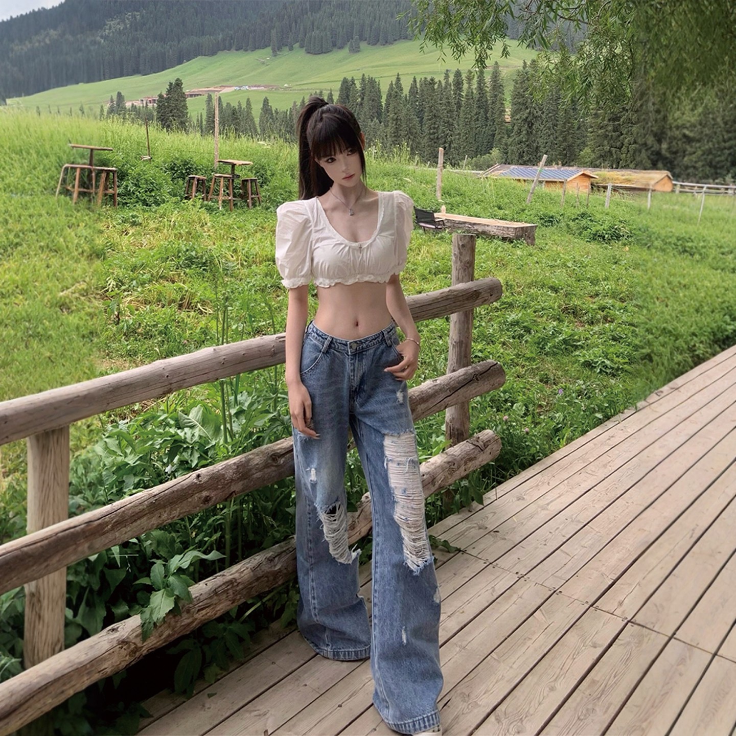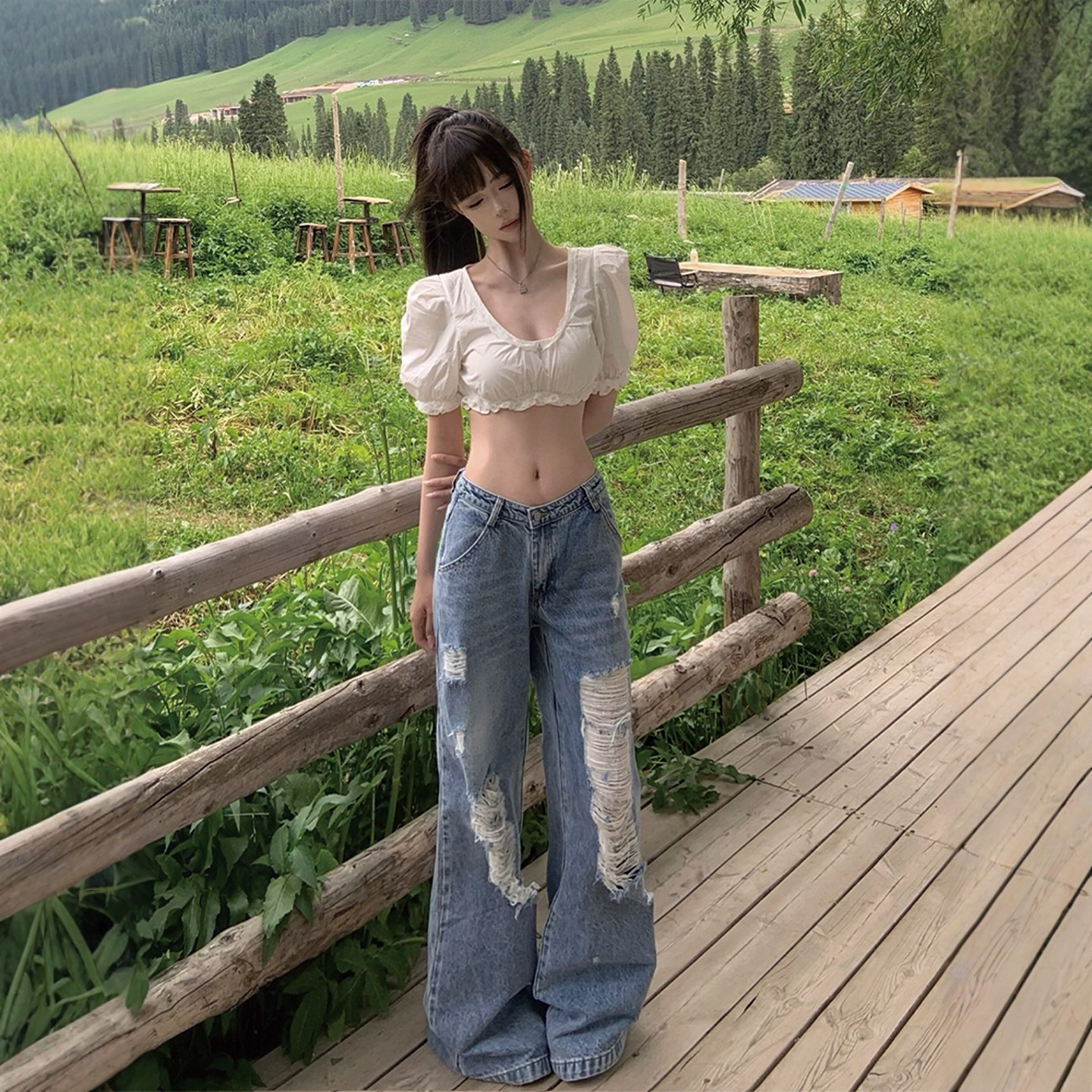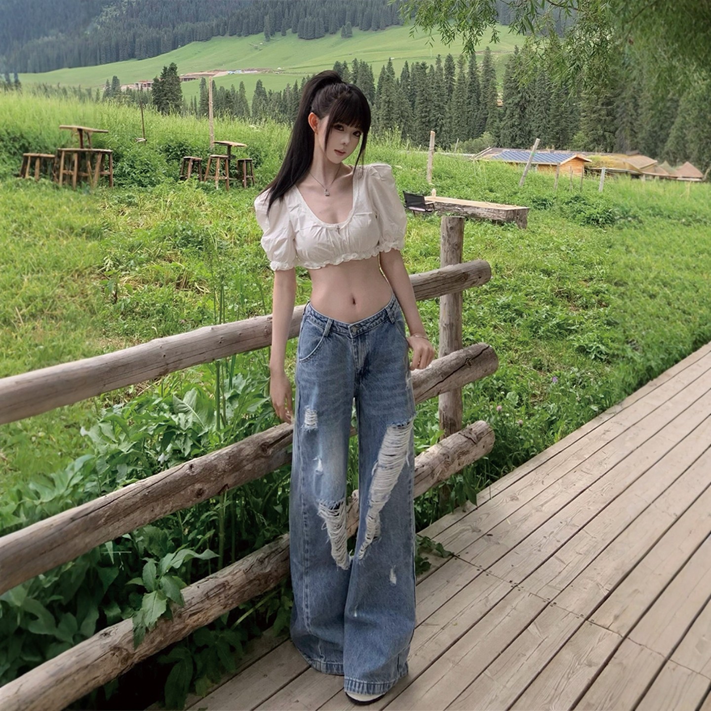 美式高街辣妹破洞牛仔裤女2025夏季设计感复古宽松bf慵懒风阔腿裤
