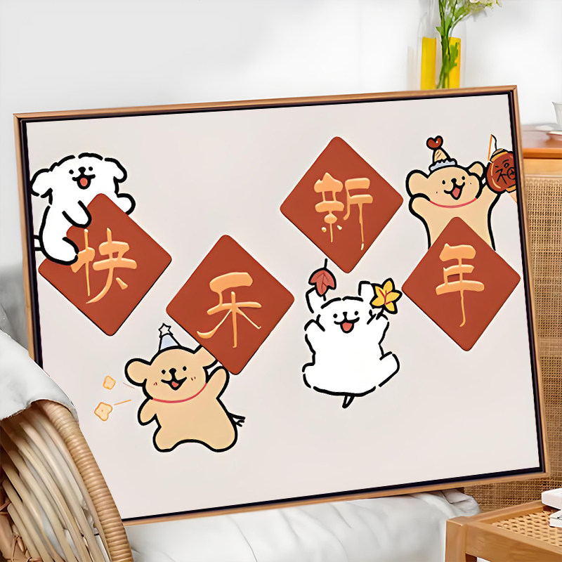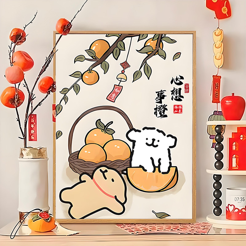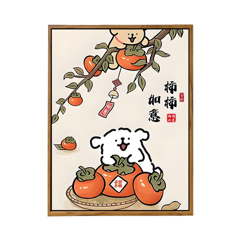 中国风柿柿如意线条小狗DIY数字油画手工绘填充涂色卡通装饰挂画