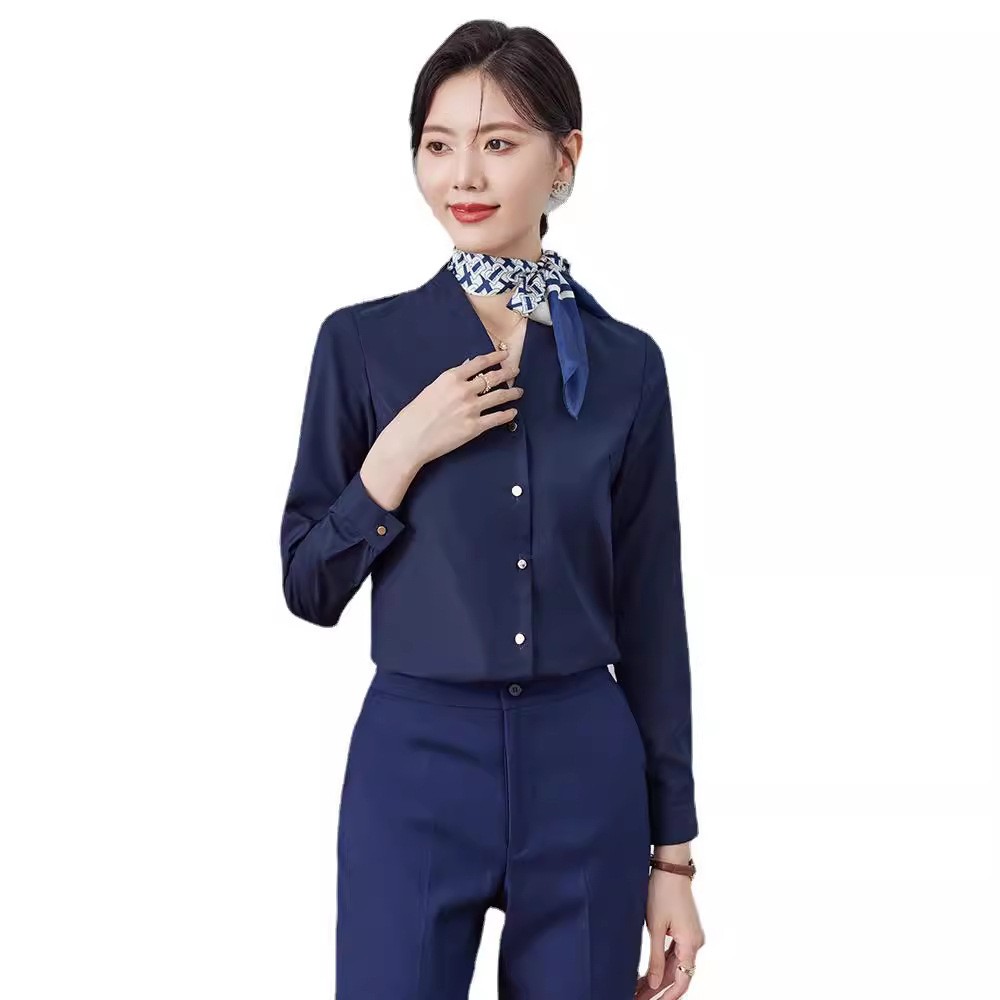 雪纺衬衫女V领长袖春秋时尚宽松上衣职业装打底衫知性气质白衬衣