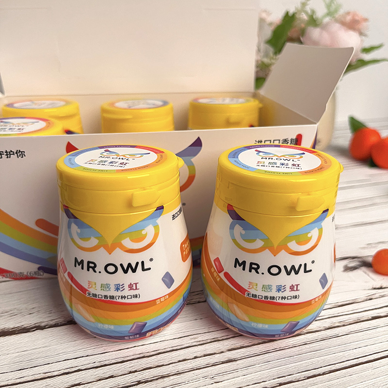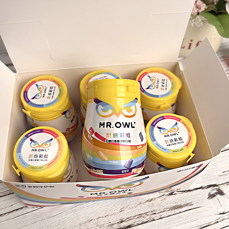 猫头鹰先生彩虹无糖口香糖进口木糖醇50g瓶装韩国接吻糖强薄荷凉