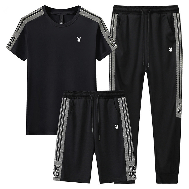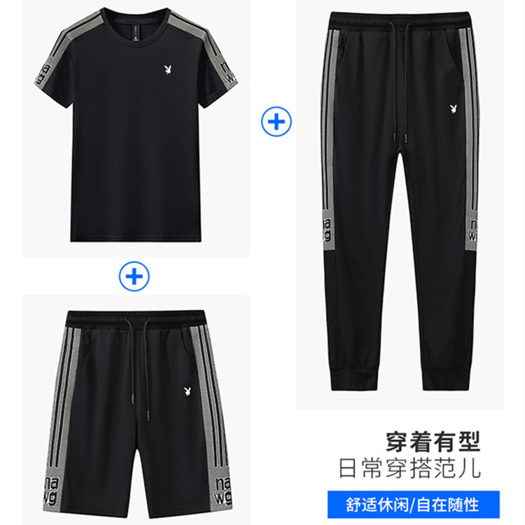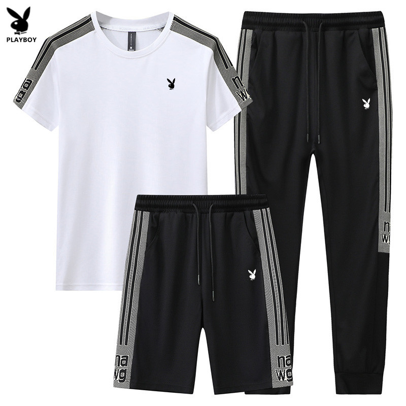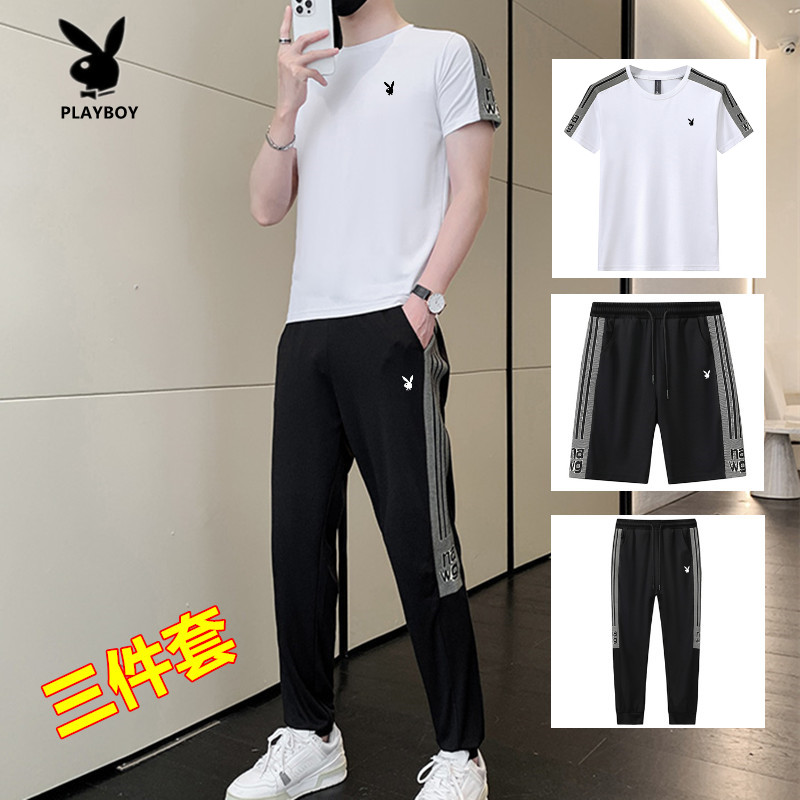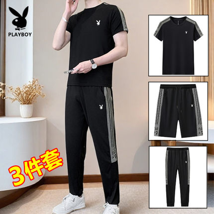 花花公子套装男夏季新款休闲运动服冰丝短袖T恤长裤跑步三件套潮