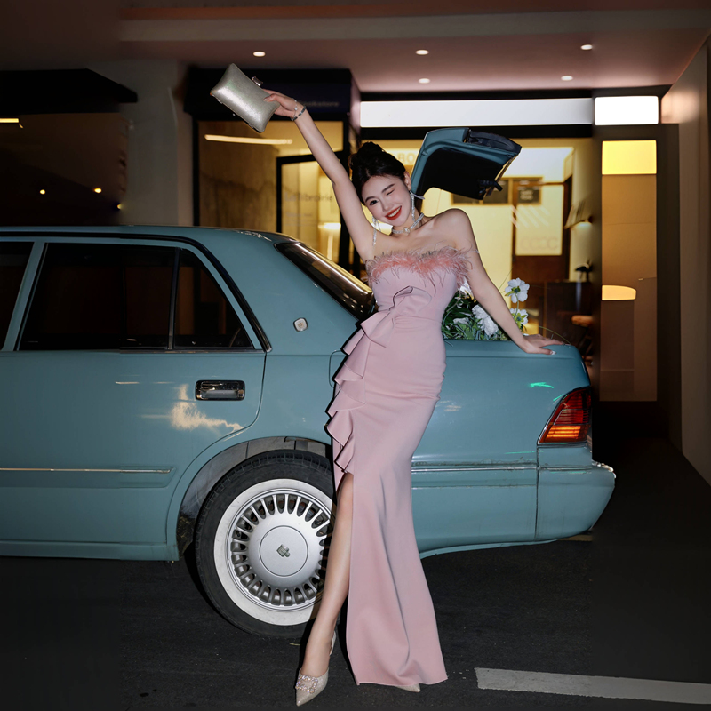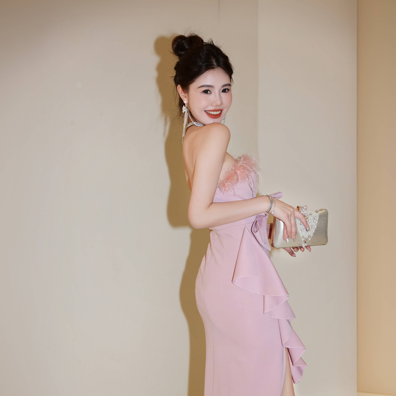 粉色晚礼服抹胸毛毛蝴蝶结公主风成人礼生日结婚主持人鱼尾连衣裙