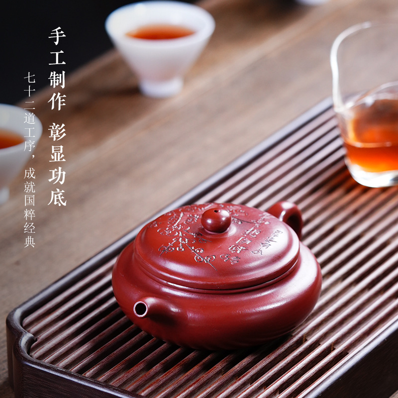 紫砂壶 纯手工刻绘宜兴原矿大红袍扁腹壶家用单壶11412