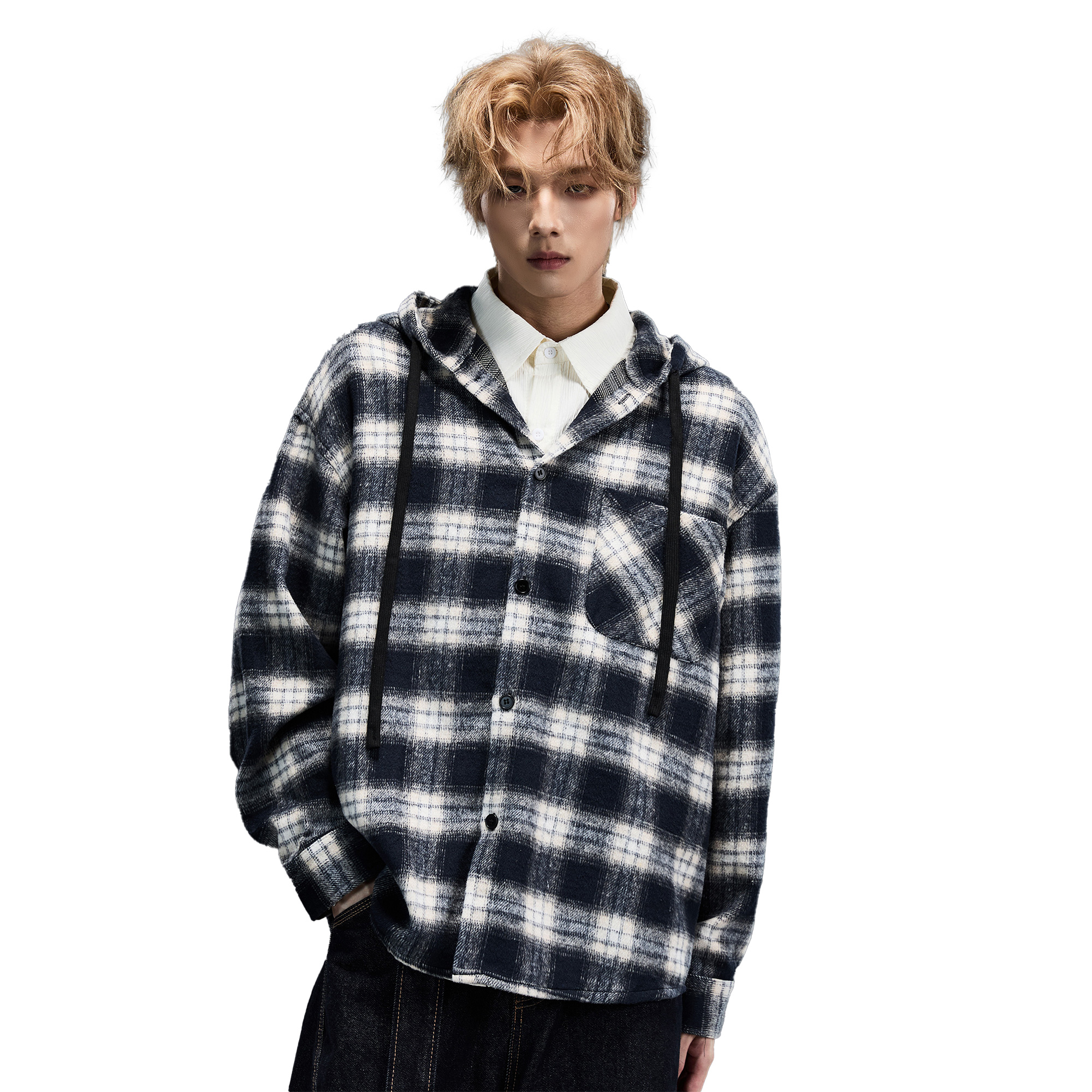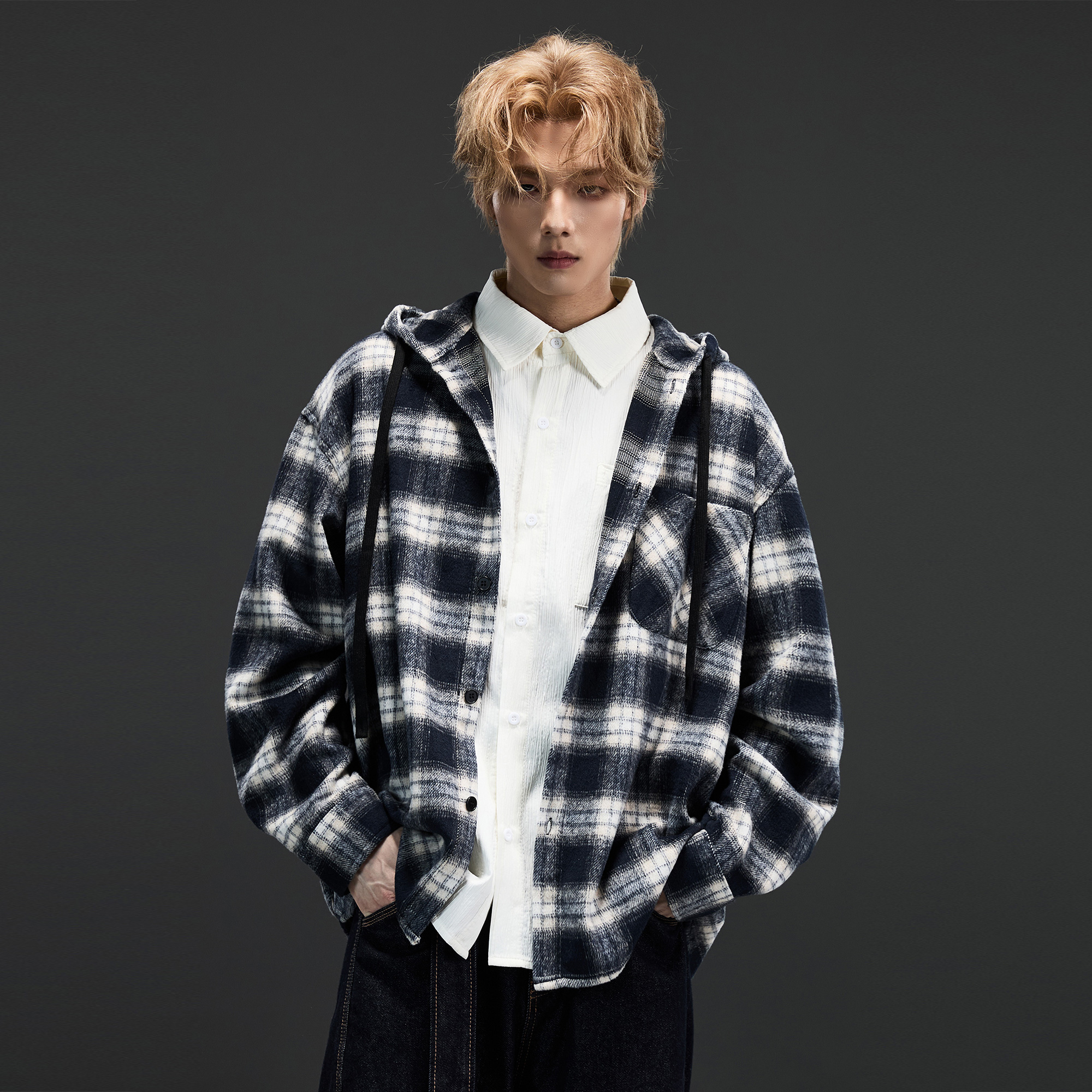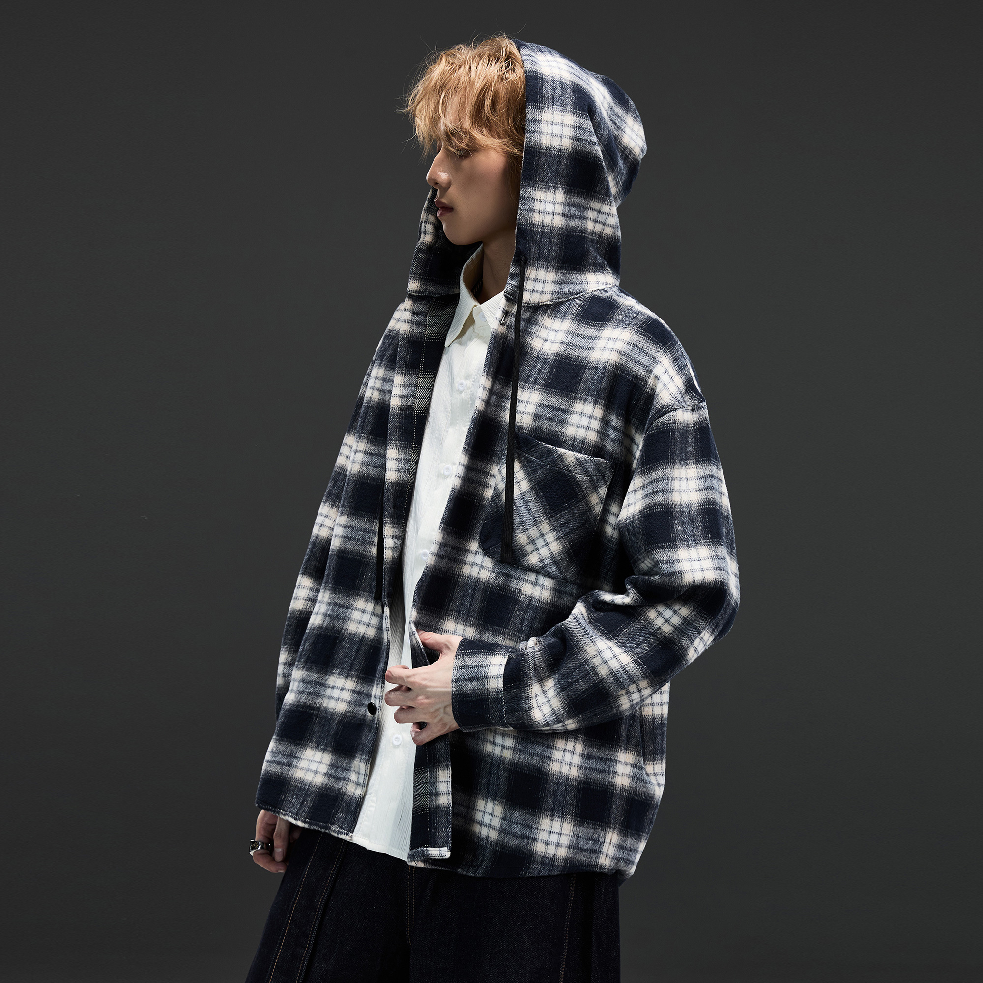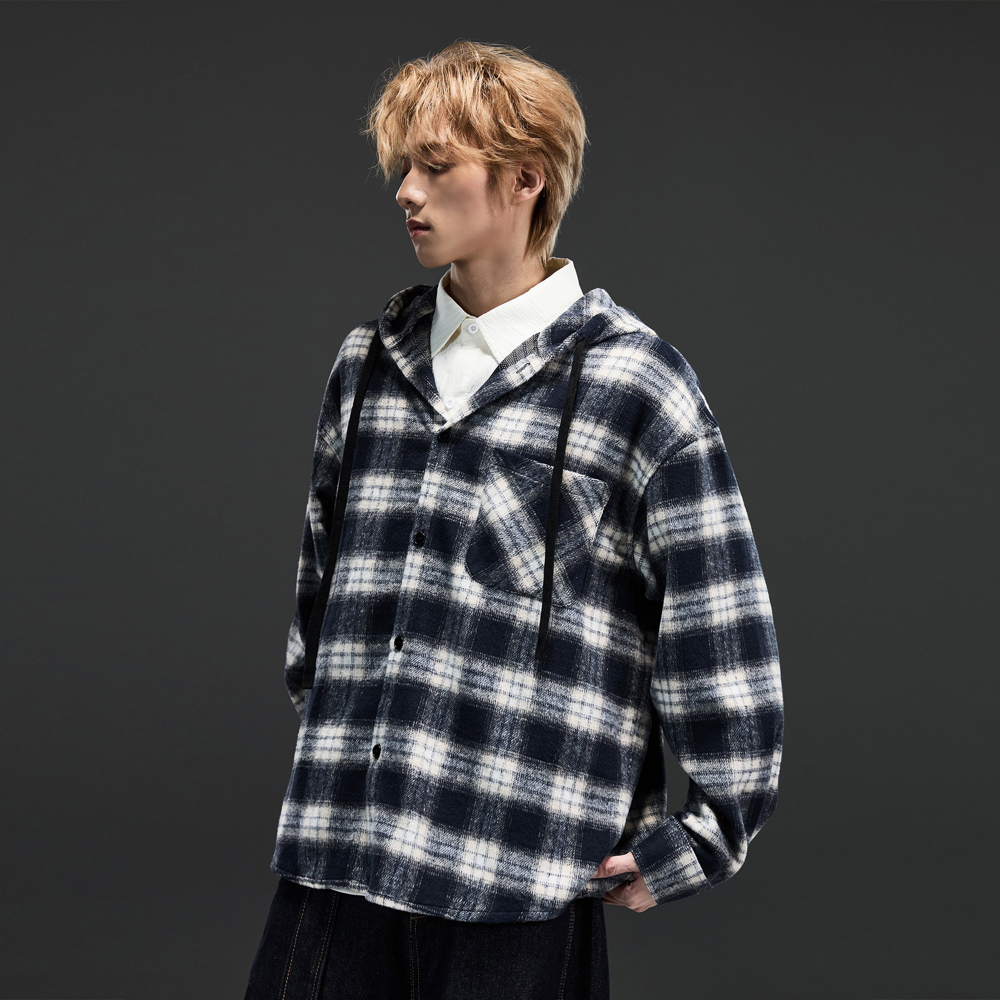 ALLIN 连帽格子长袖衬衫男秋冬潮牌复古衬衣高街休闲百搭情侣外套