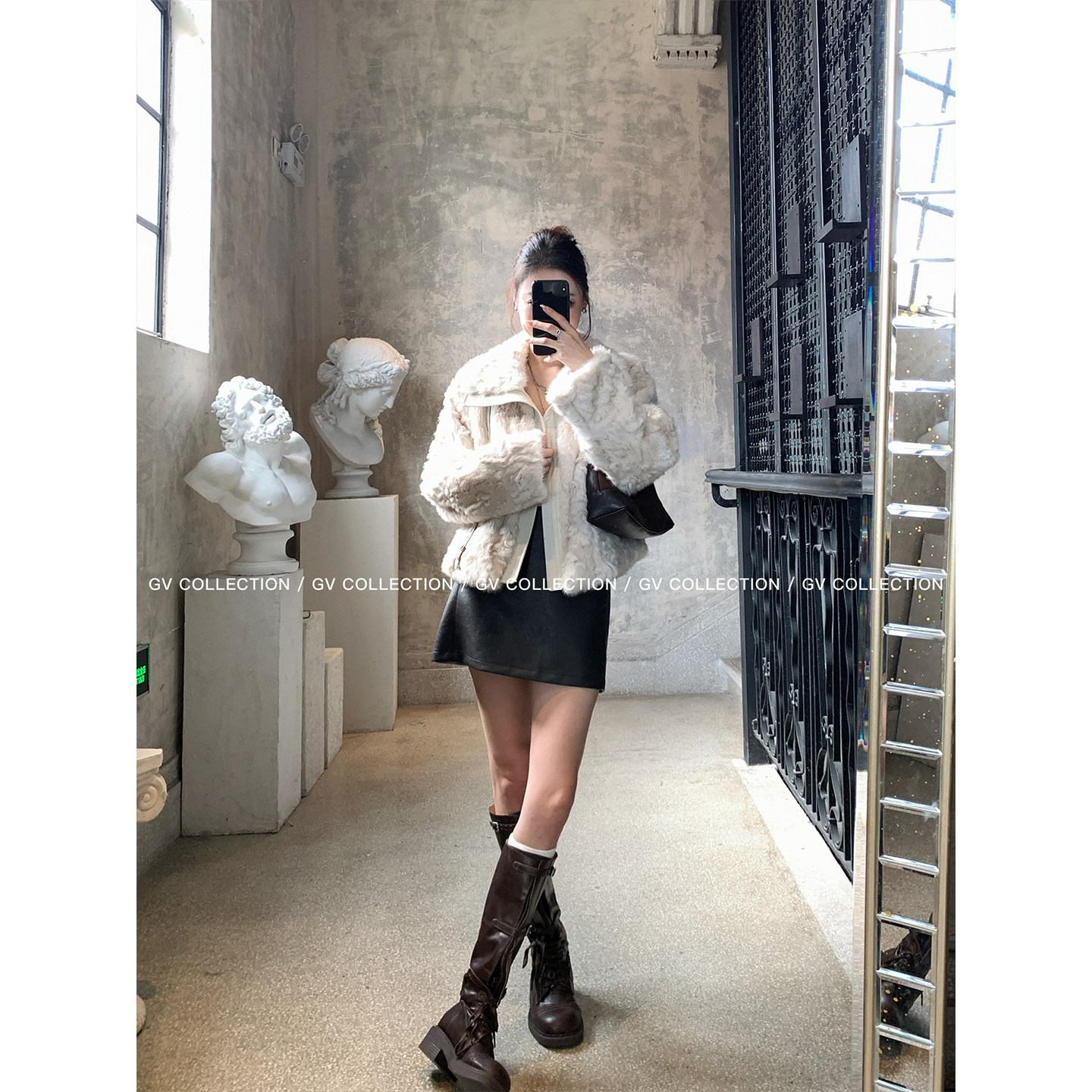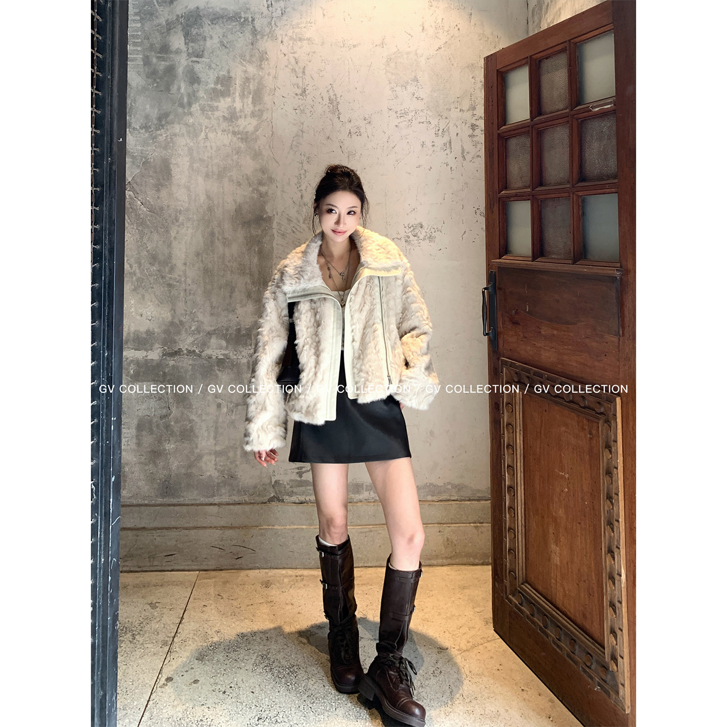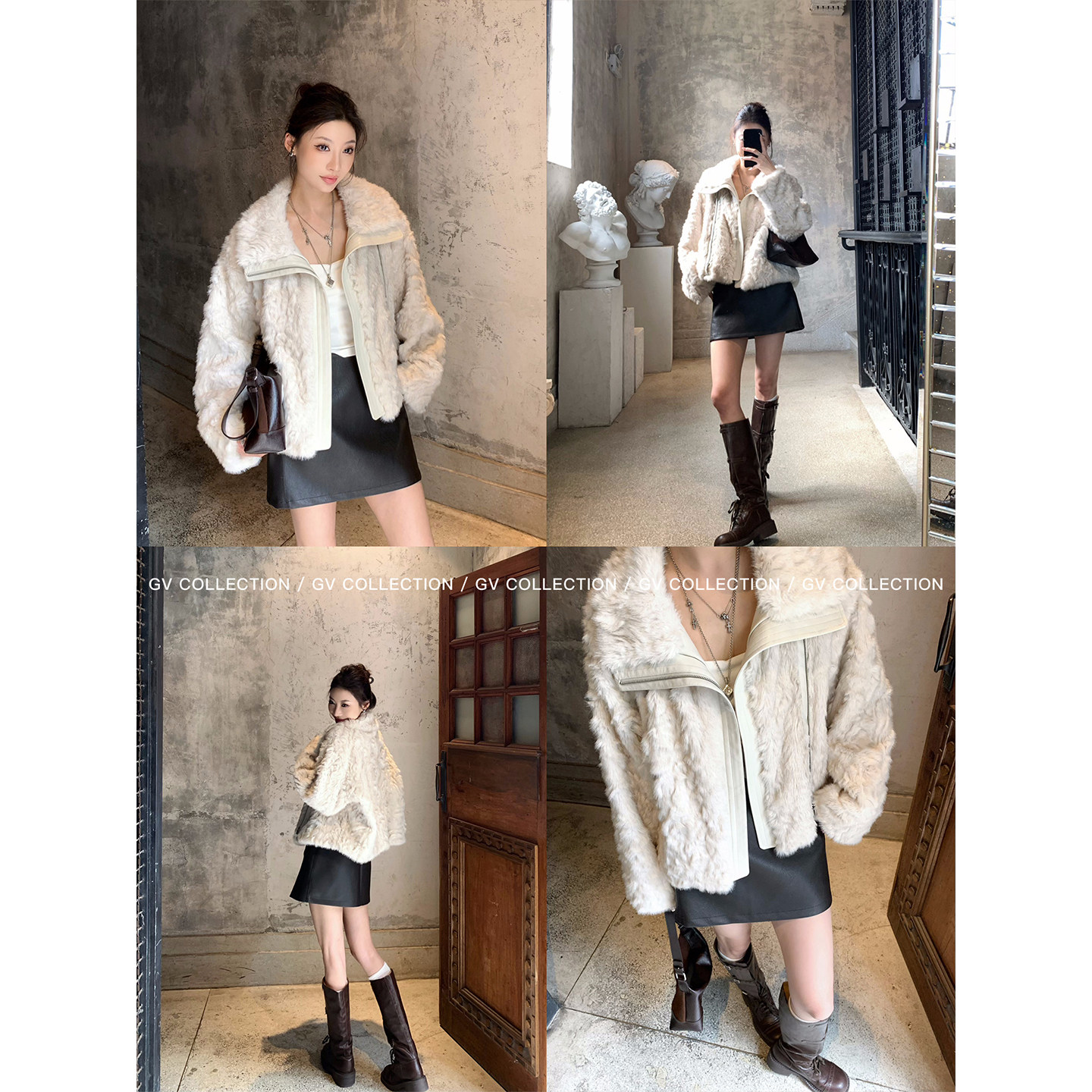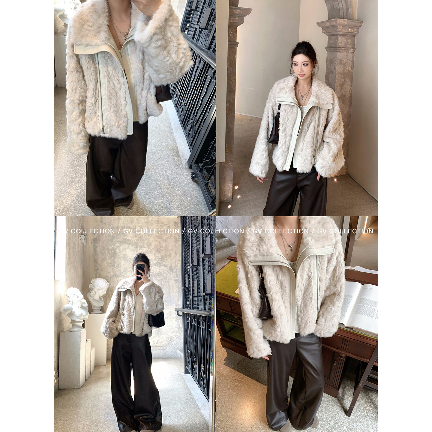 GV大白哥 东京买手 设计感环保毛拼皮翻领夹克外套冬季新款上衣女