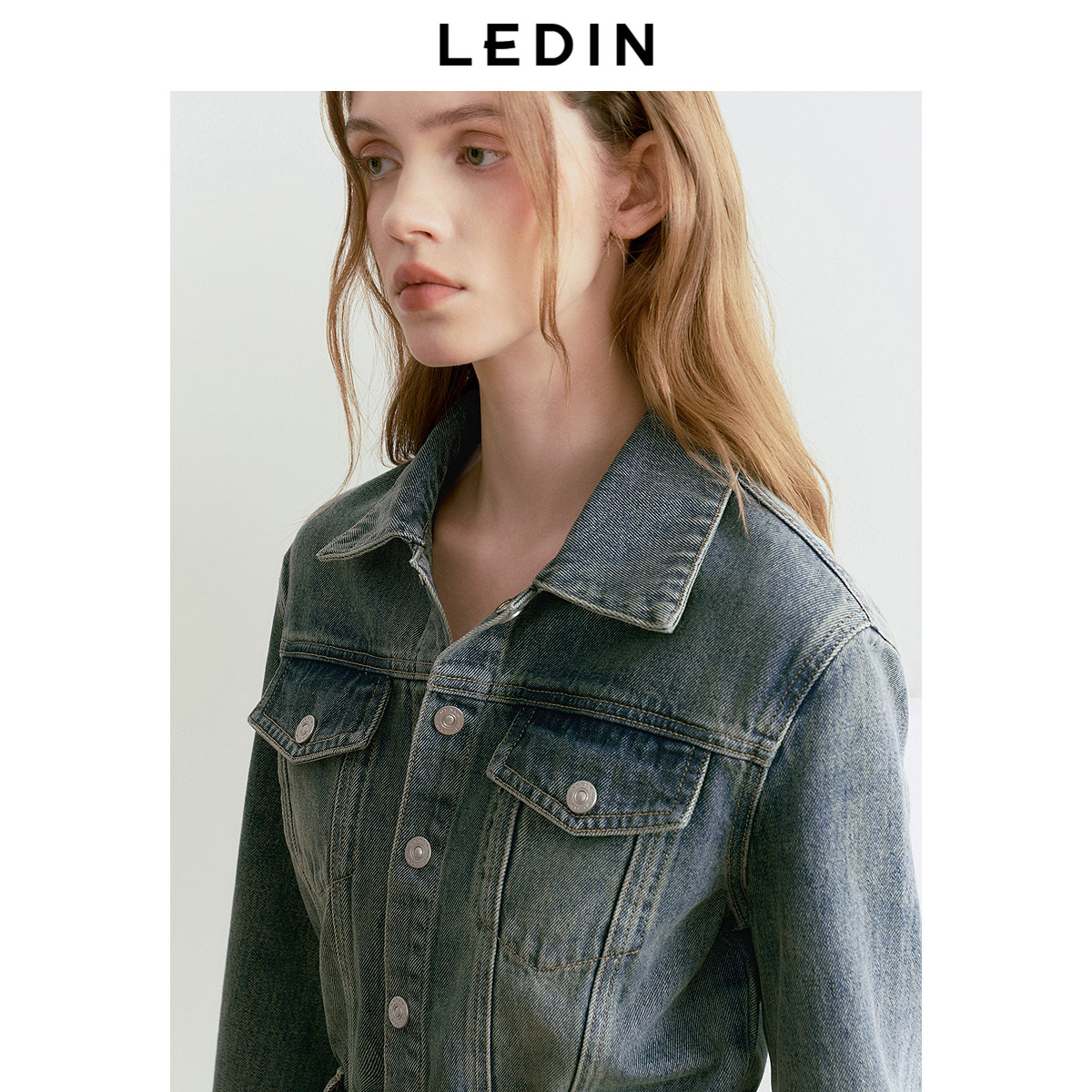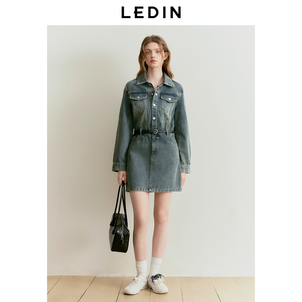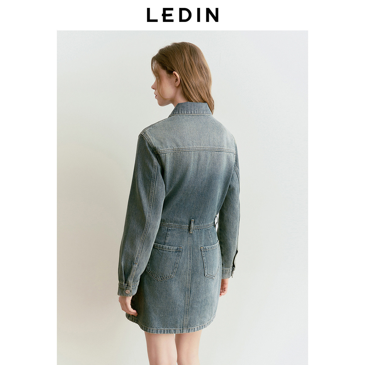 乐町复古水洗长袖牛仔裙女25年春季新款工装风口袋设计休闲连衣裙