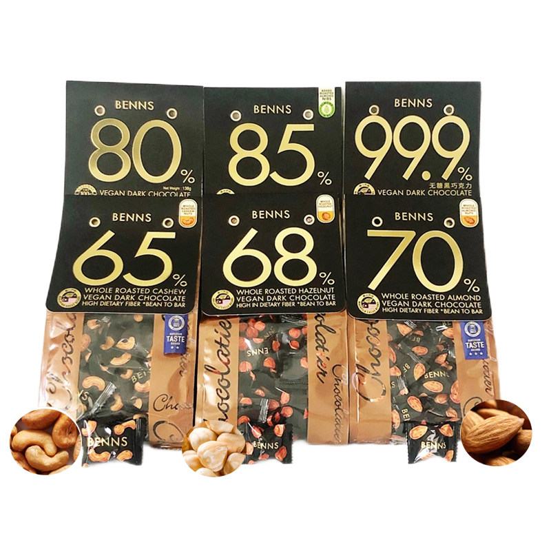 贝纳丝benns坚果巧克力巴旦木榛子腰果夹心黑巧138g纯可可脂零食