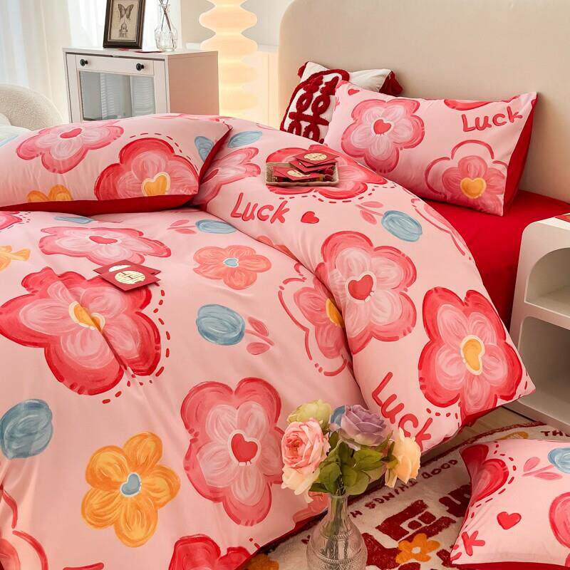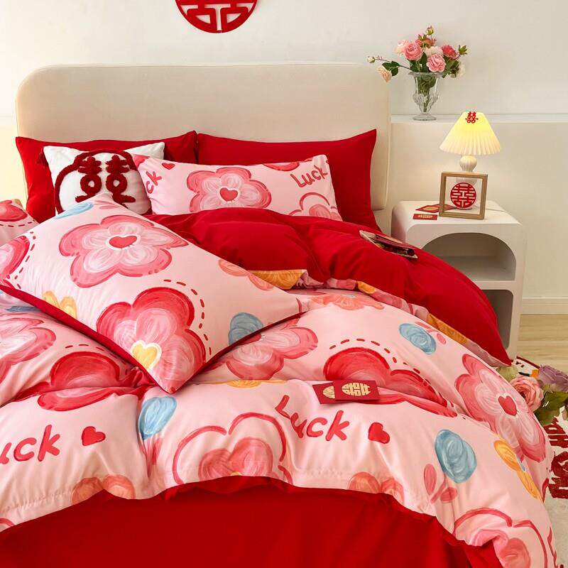 简约婚庆四件组红色备婚陪嫁床单被套高档结婚床上用品新婚房喜被