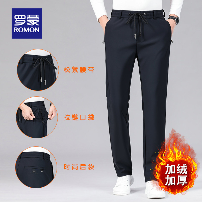 罗蒙男士直筒裤加绒新款松紧腰系绳高弹力拉链爸爸裤子中年男裤