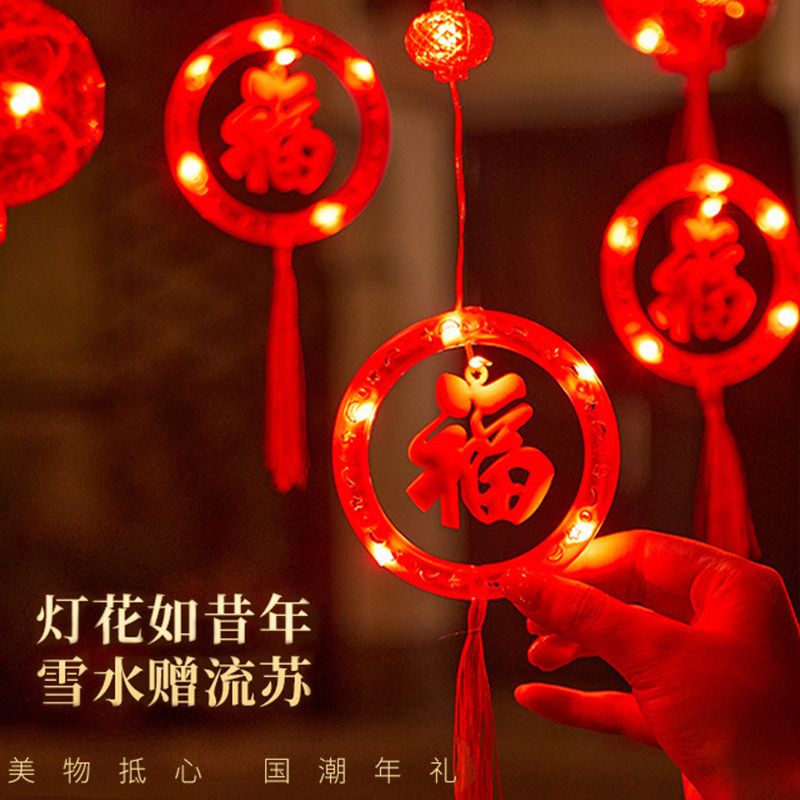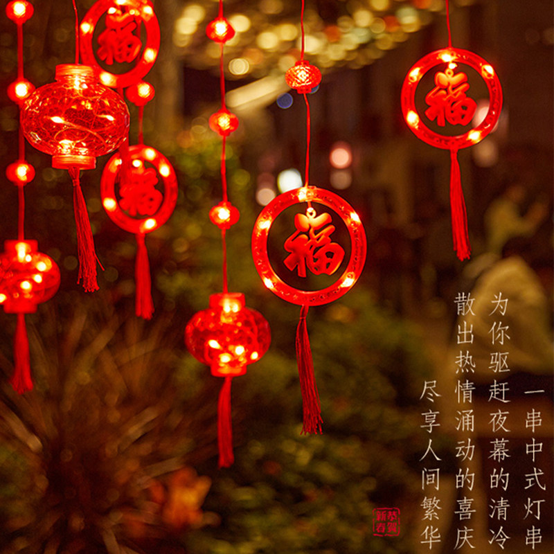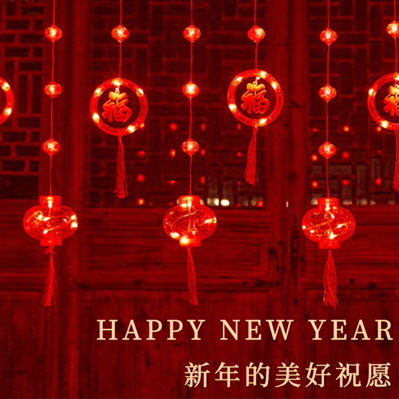 2026新年发光福字喜庆红灯笼春节户外阳台布置圆环窗帘灯闪灯串灯