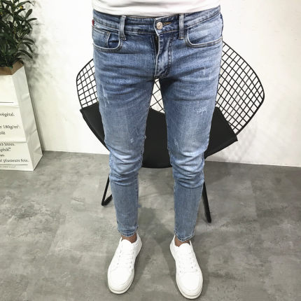 潮男夏新韩版修身弹力九分浅蓝小脚牛仔裤社会人青年快手抖音百搭