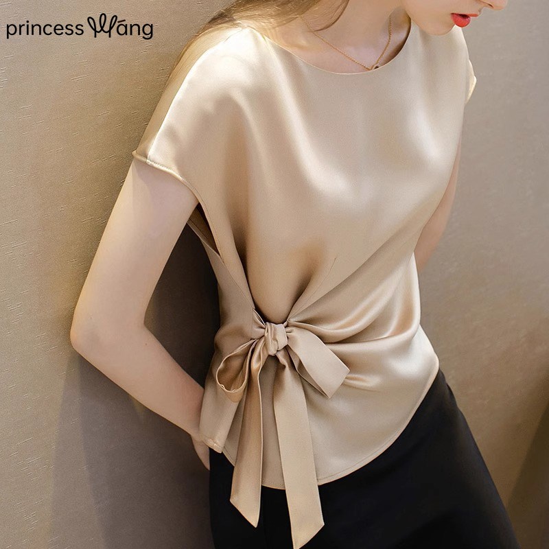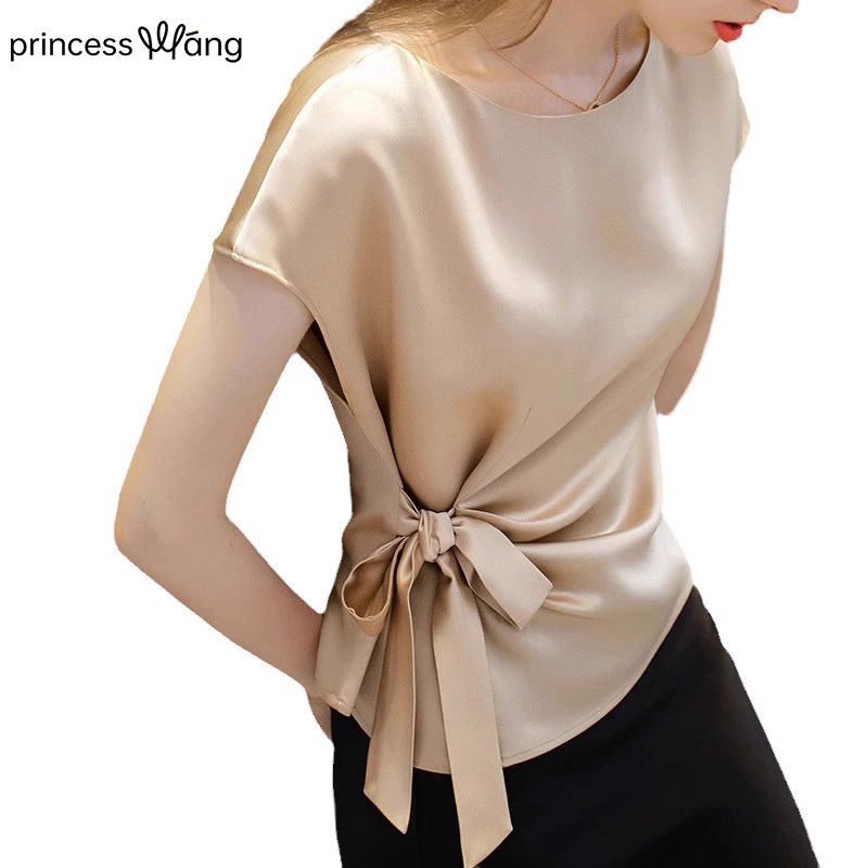收腰醋酸缎面短袖T恤女夏季2025新款真丝绑带衬衫设计感气质上衣