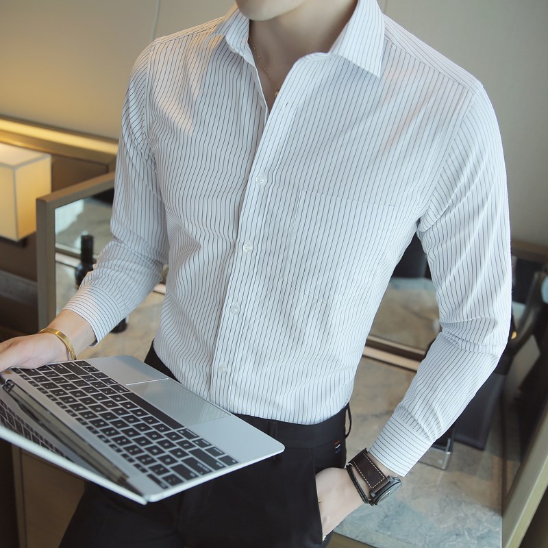 蓝白竖条纹衬衣男士长袖免烫抗皱衬衫秋季商务休闲中年正装高级感